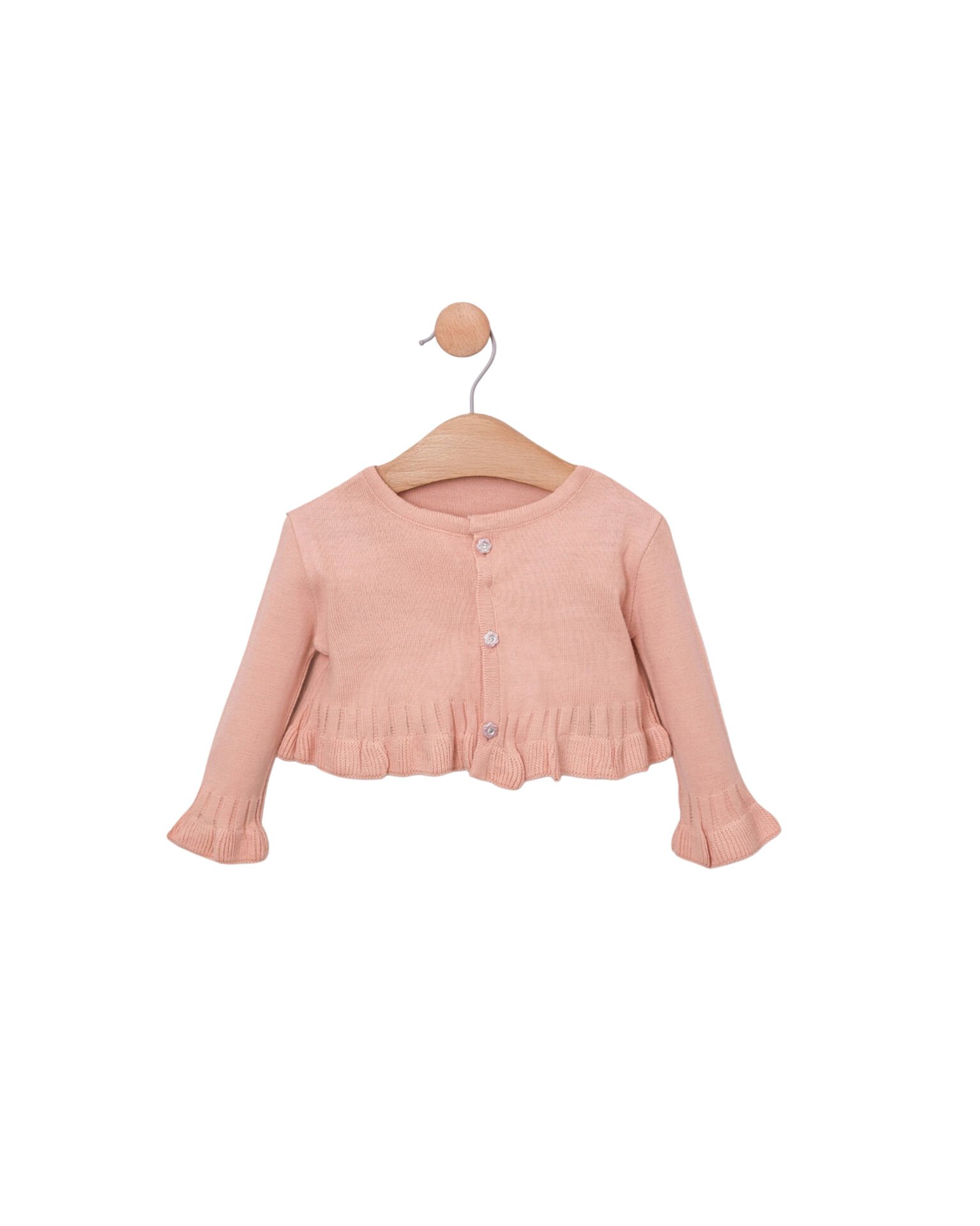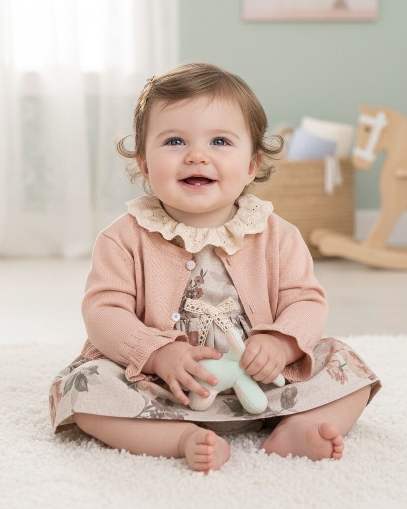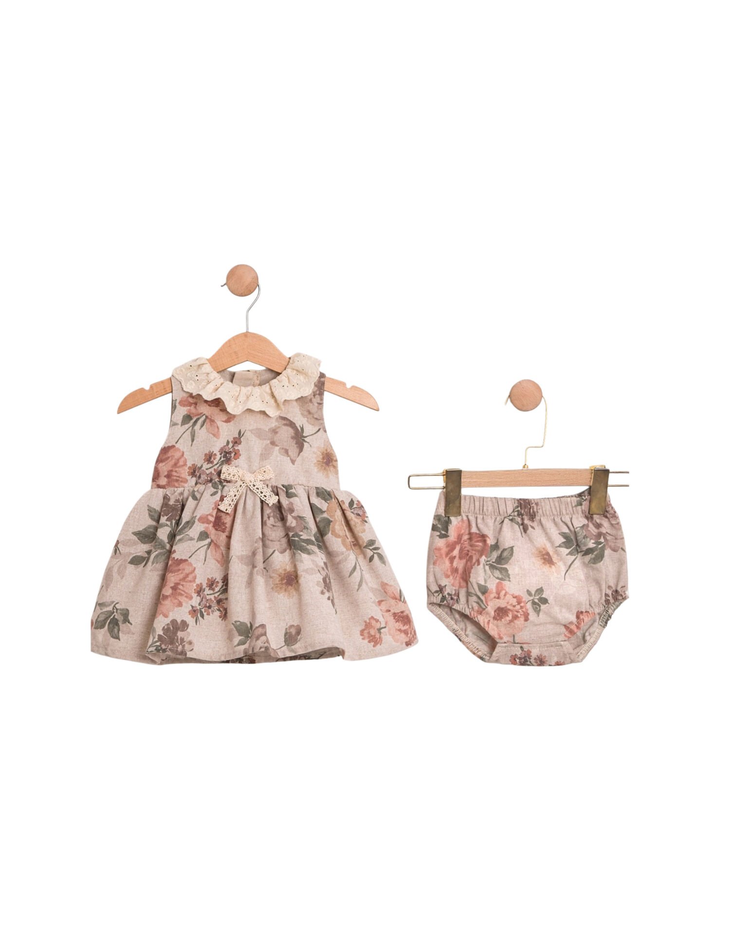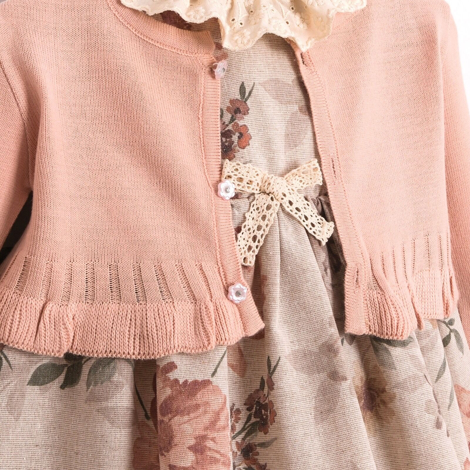 Pastel tonlardaki çiçek desenleriyle süslenen elbise, ön kısmındaki zarif dantel ve fiyonk detaylarıyla estetik bir görünüm kazandırır. Yumuşak dokulu hırka, serin havalarda bebeğinizi sıcak tutarken, külotlu alt parça ise rahat kalıbıyla gün boyu konfor sağlar.