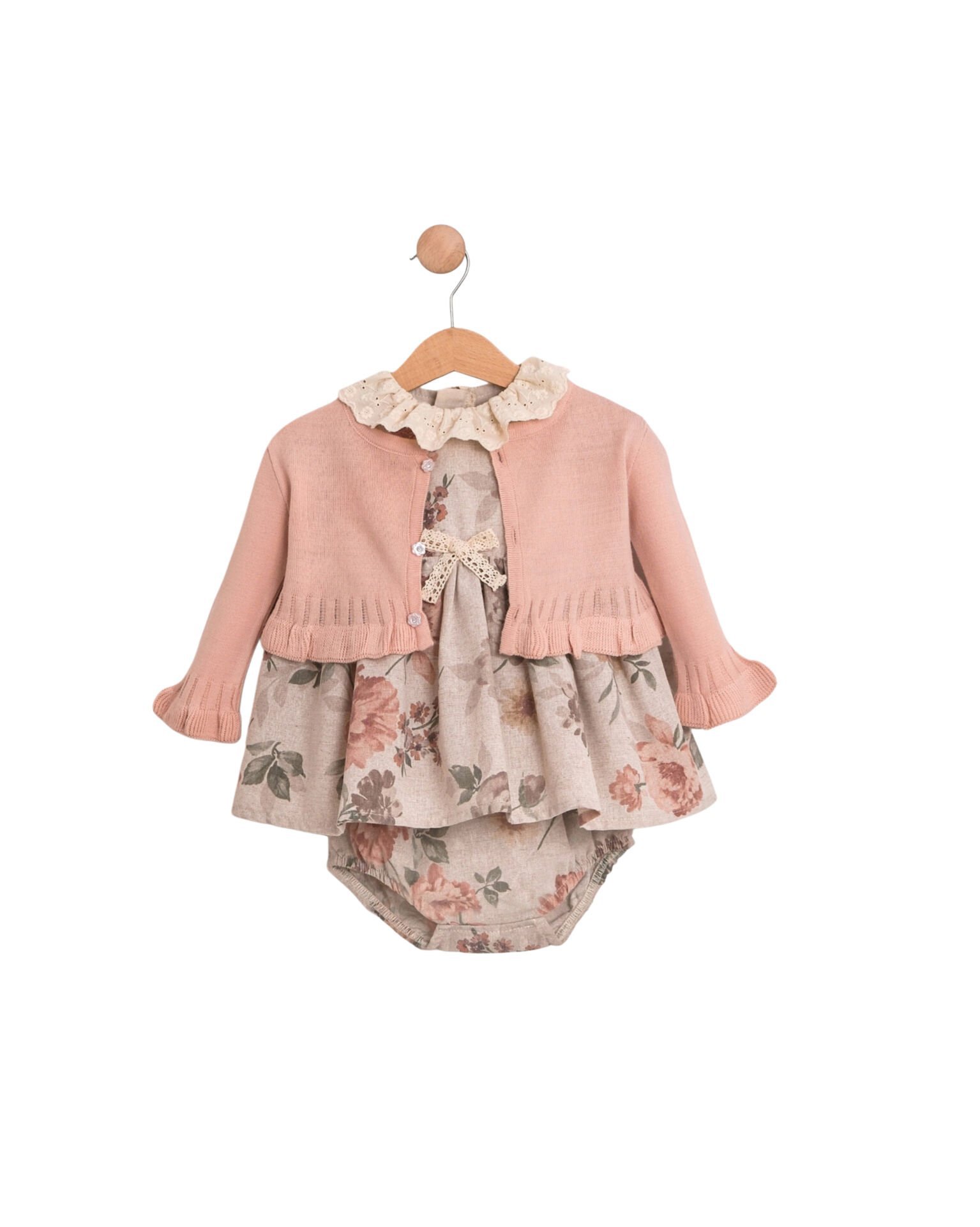 2. Örgü Bebek Hırkası: Elbiseyle mükemmel uyum sağlayan, somon renginde yumuşak örme hırka. Hırkanın yakasında ve bileklerinde bulunan volanlı bitişler, setin zarafetini tamamlar. Düğmeli ön kapama sayesinde giydirilmesi pratiktir.