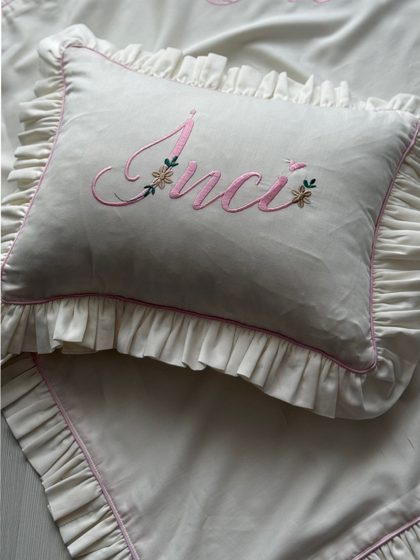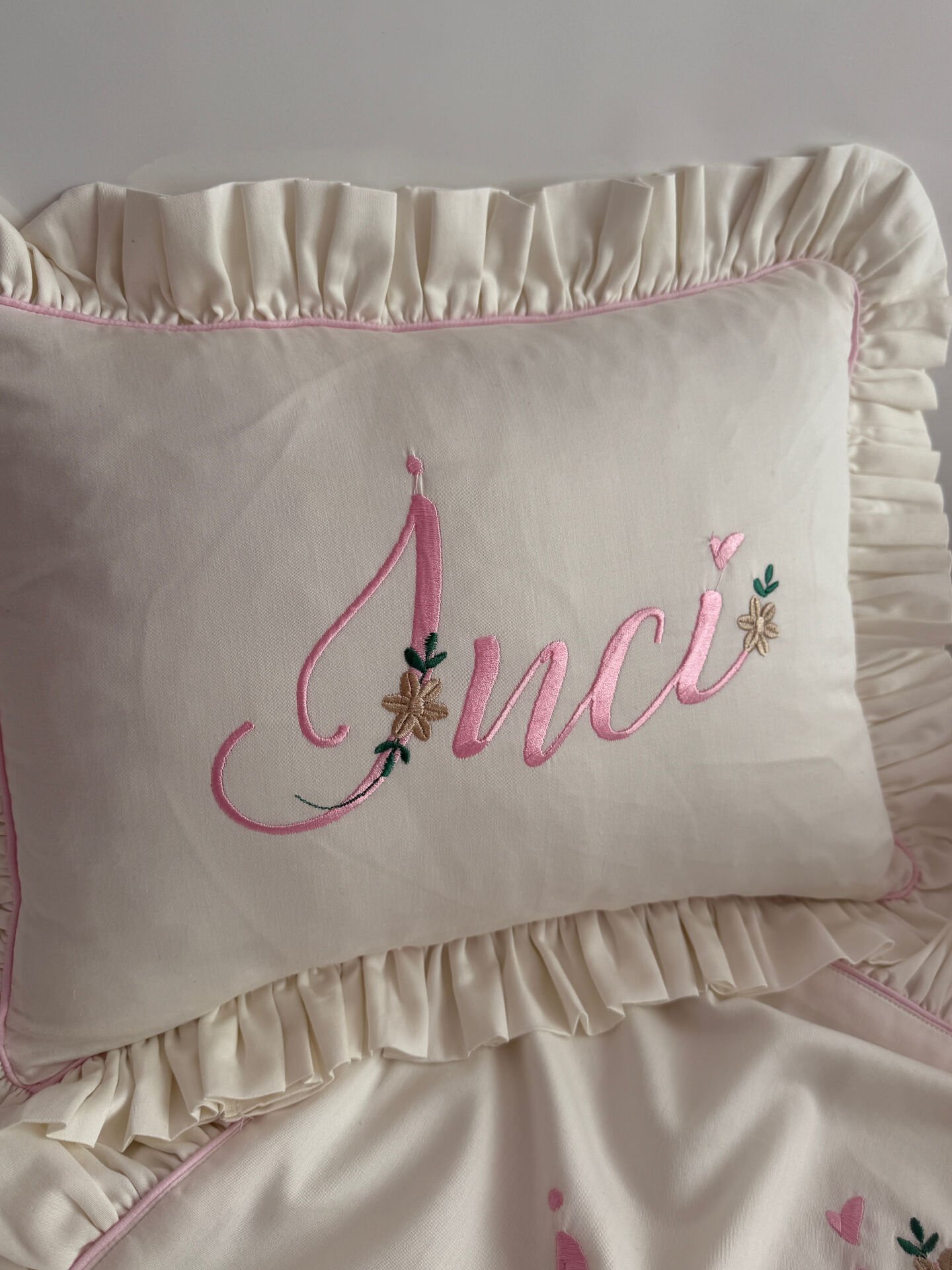 Bebeğinizin ismiyle kişiselleştirilen, tamamen el işçiliğiyle hazırlanan özel bir anı yastığı.