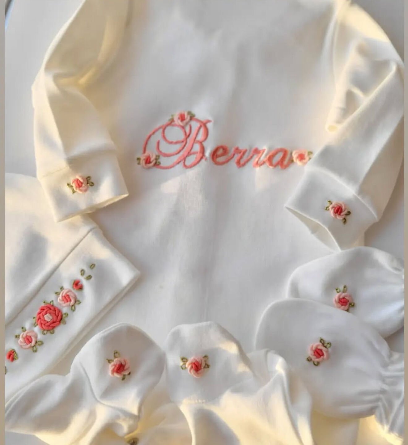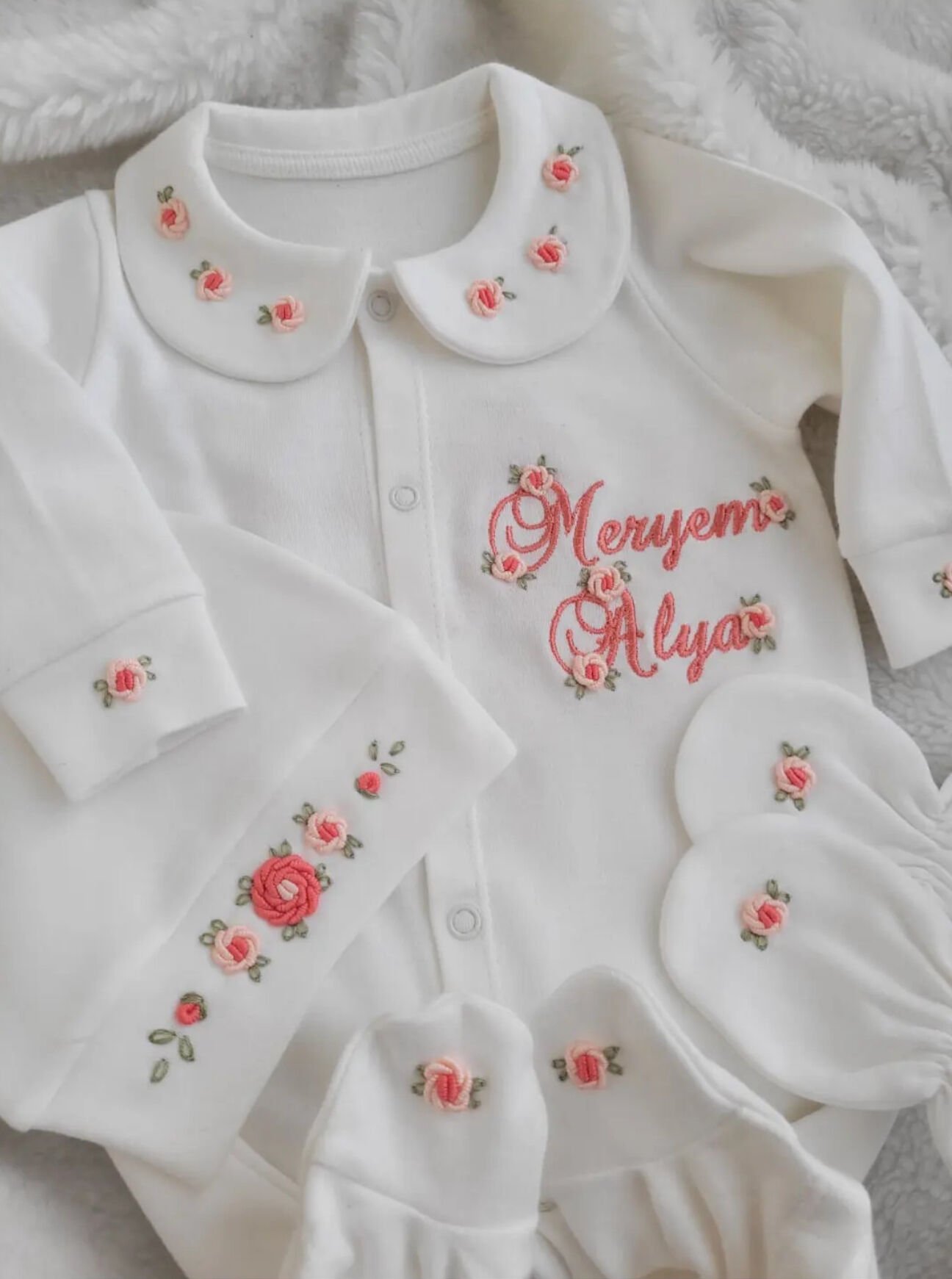 İsimli El Nakışı Rokoko Çiçekli Kız Bebek Hastane Çıkış Seti - Premium Butik Seri