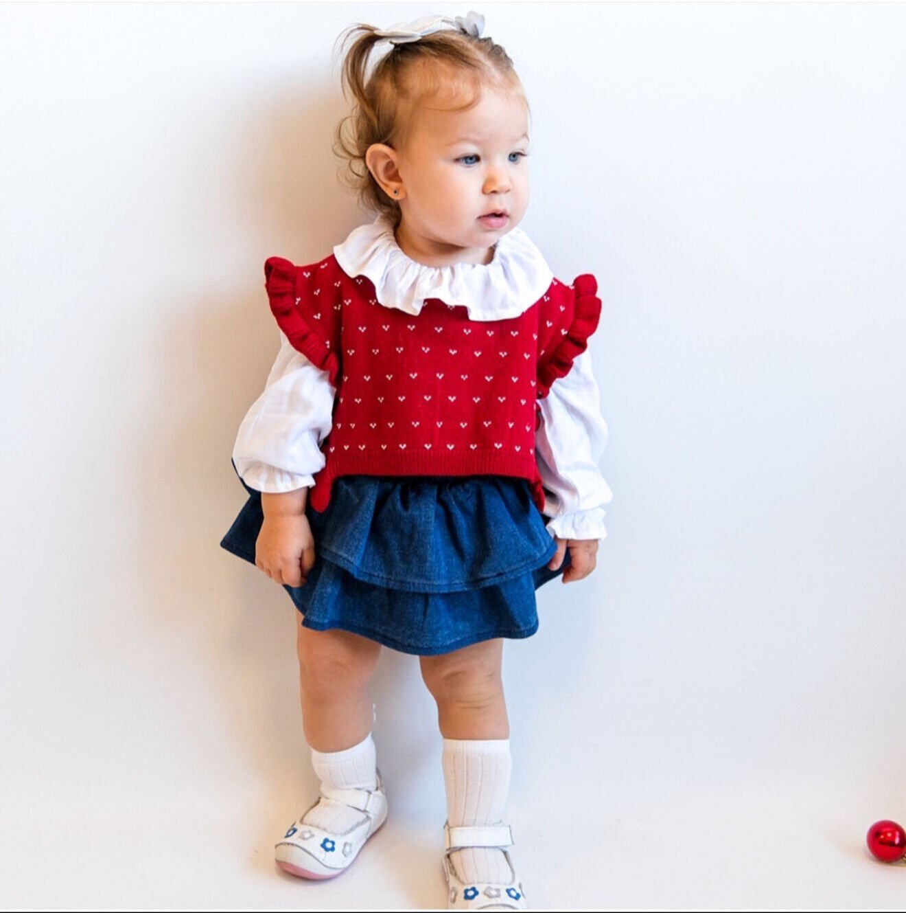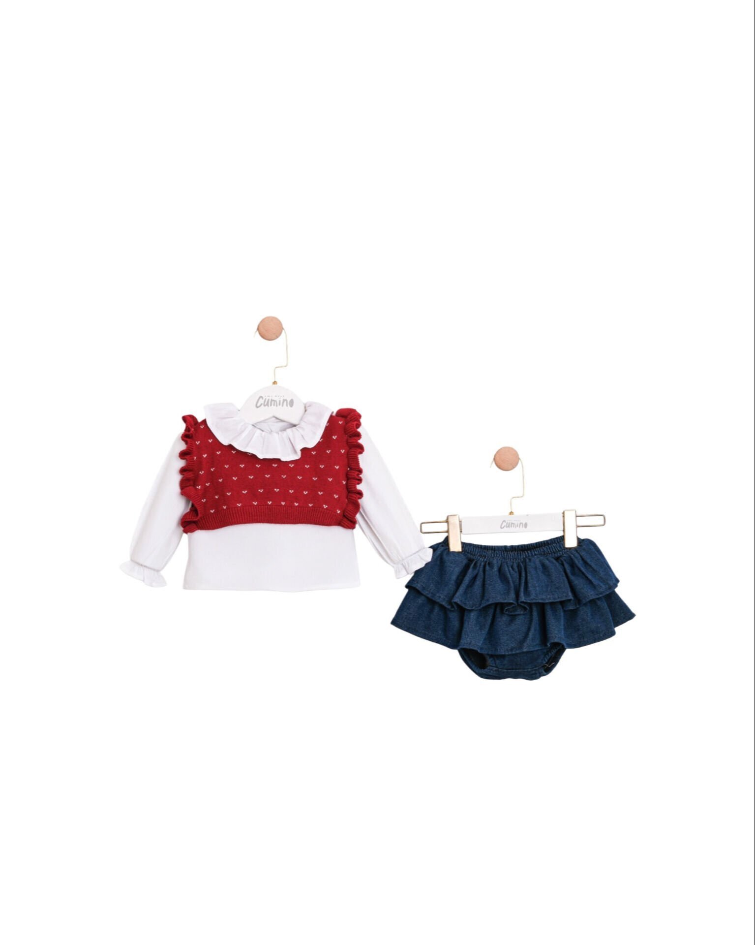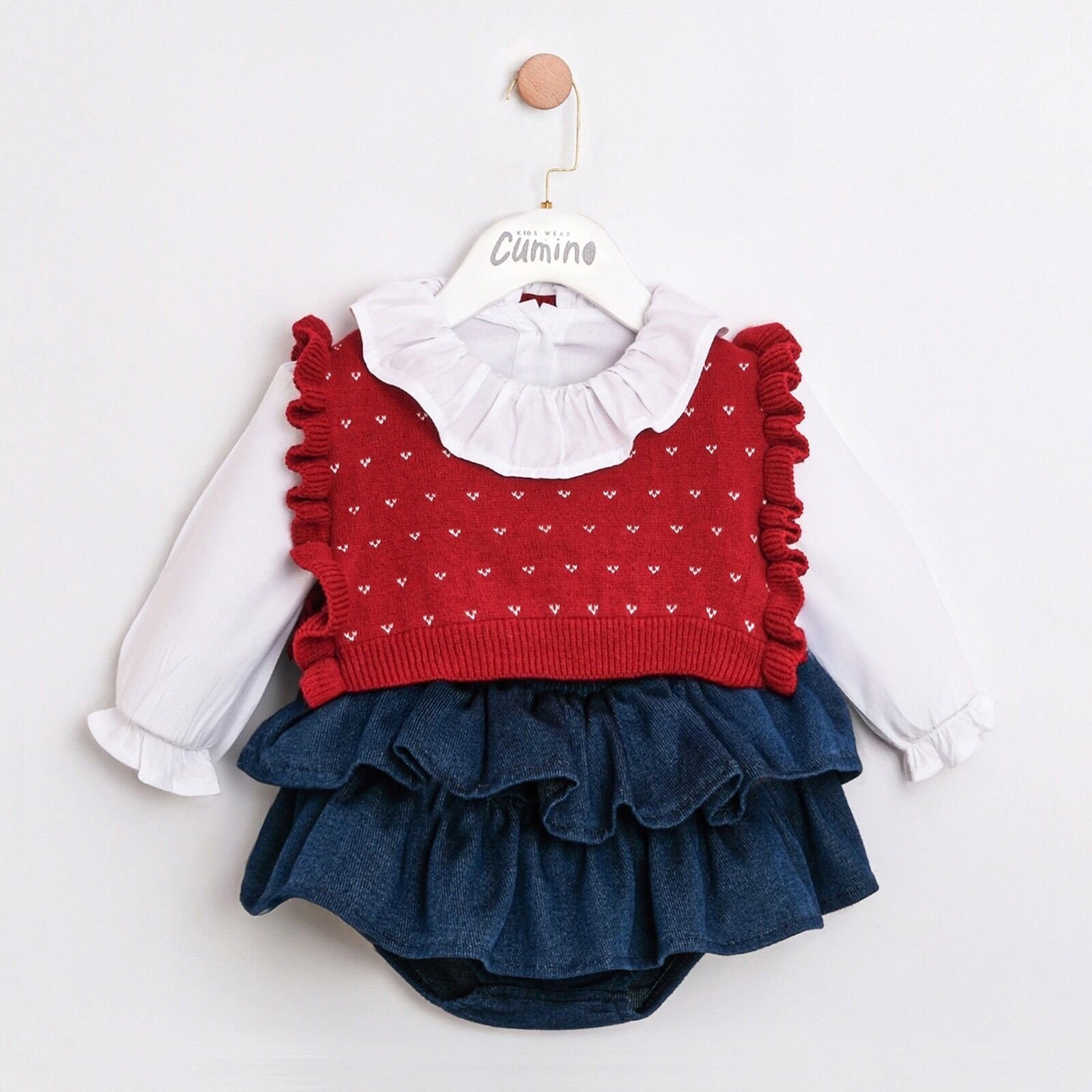 Kalpli Kız Bebek Üçlü Takım – Triko Üst, Gömlek ve Denim Etek