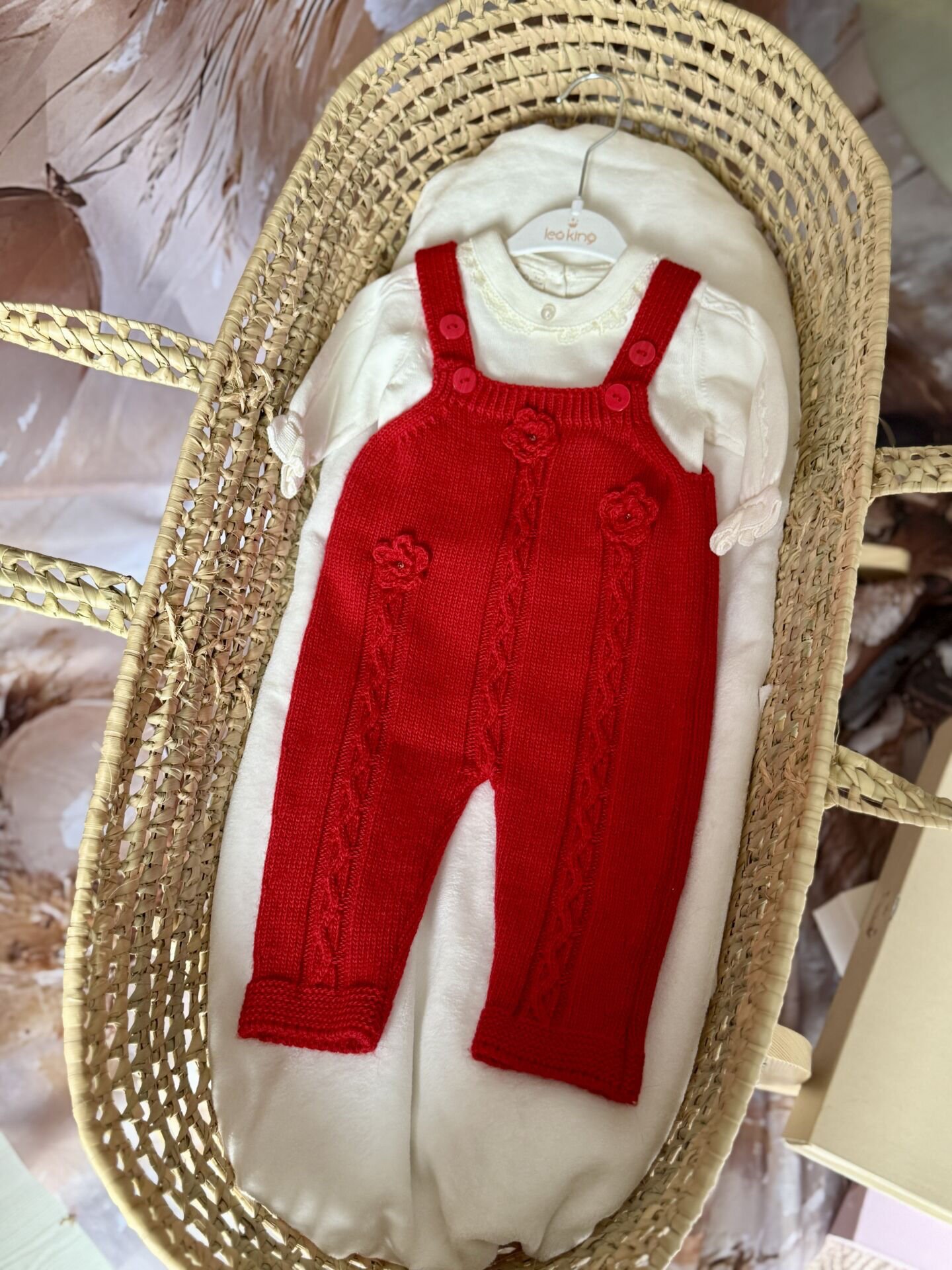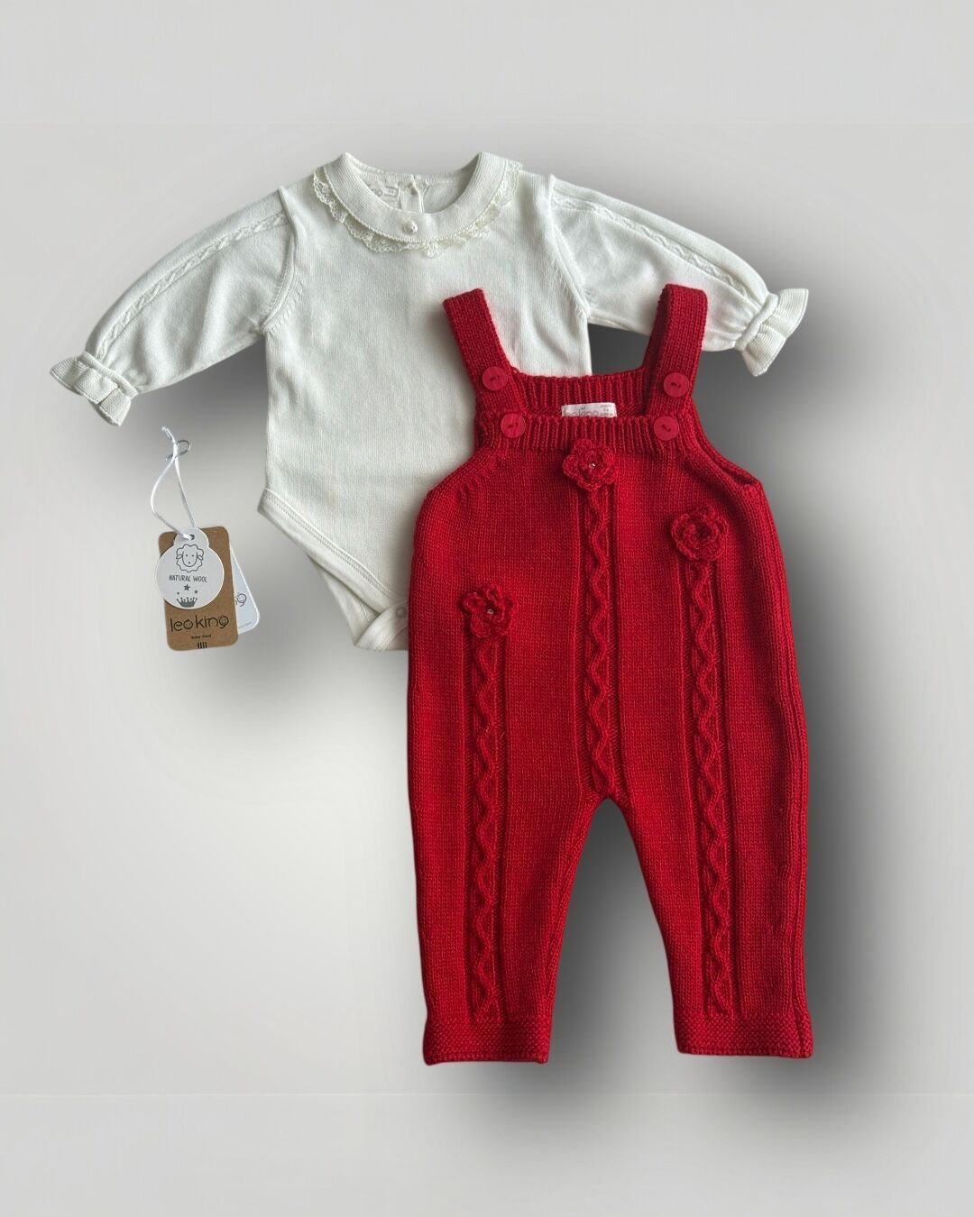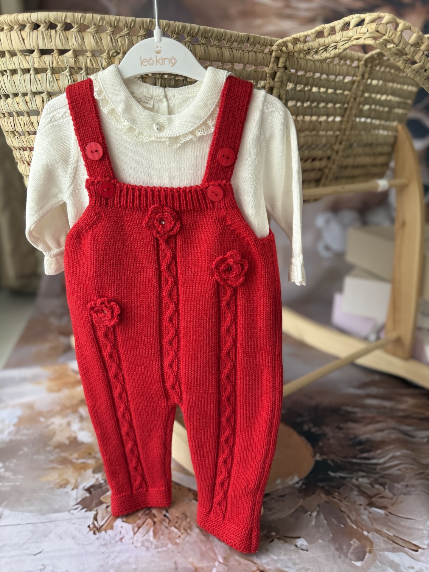 Kırmızı örgü askılı bebek tulum seti, çiçek motifli zarif tasarımıyla kız bebekler için hem şık hem de konforlu bir kombin sunar.