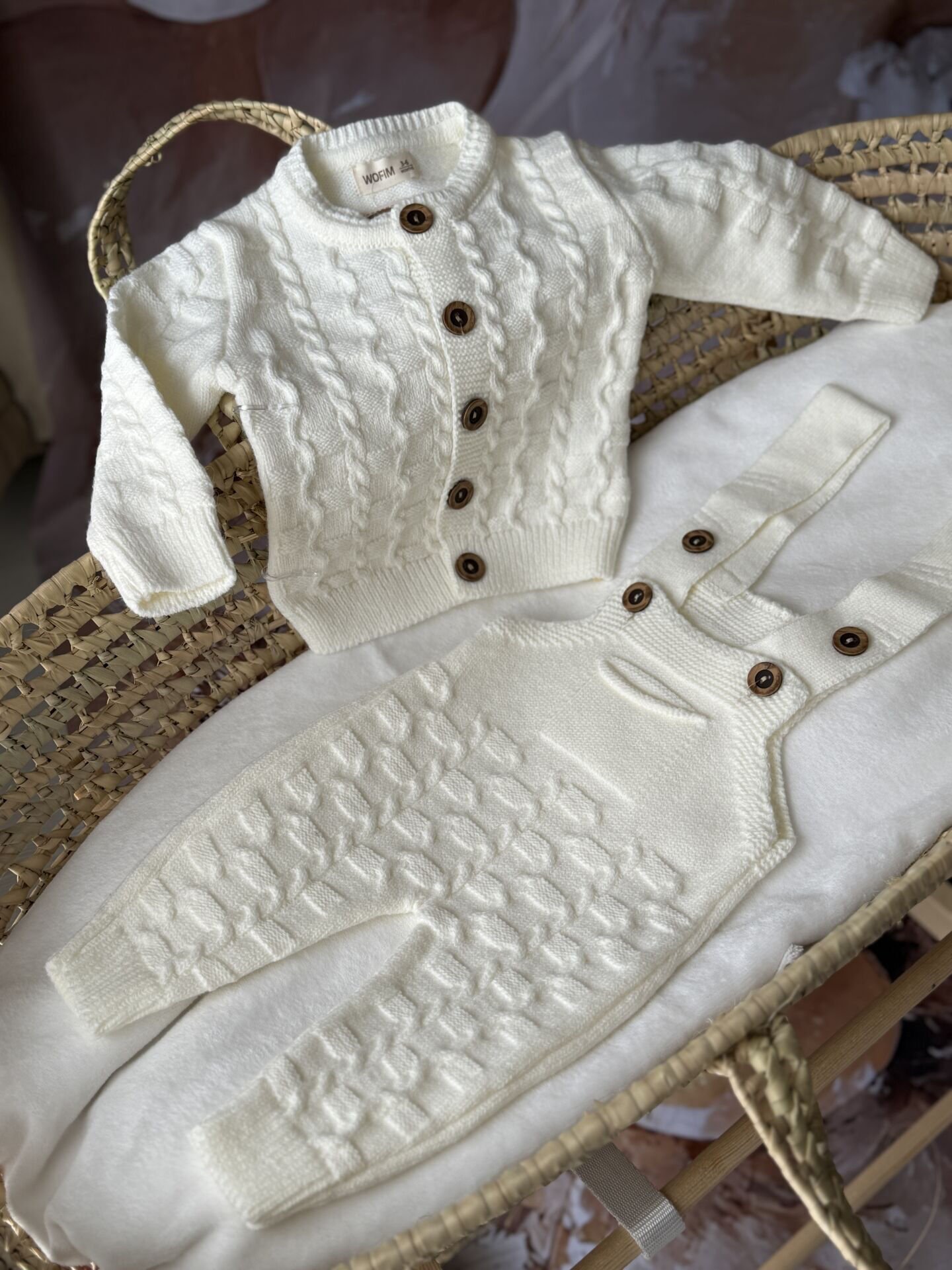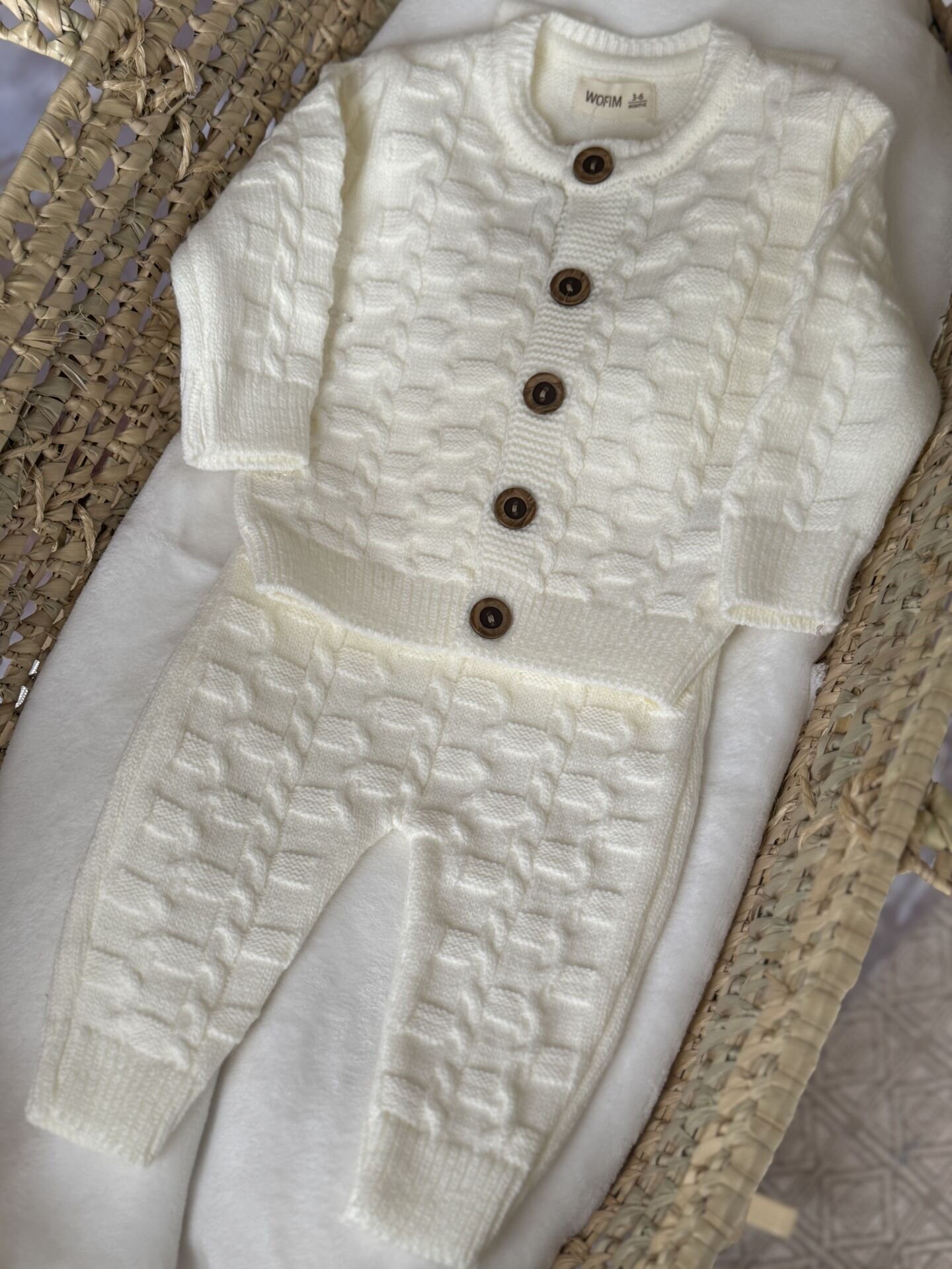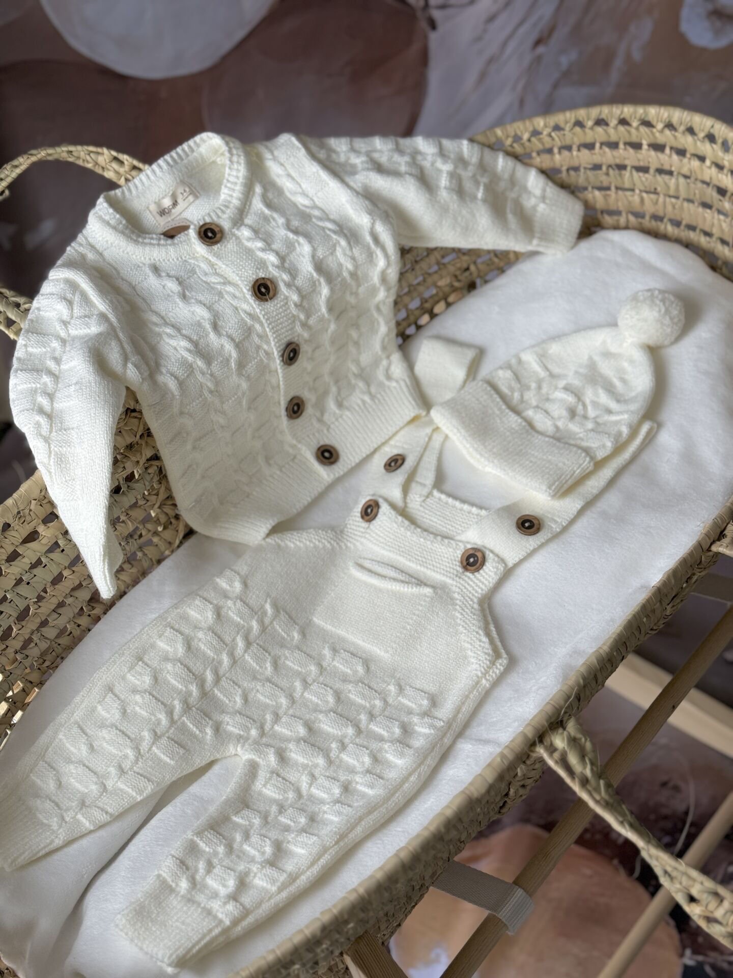Krem örgü erkek bebek 3’lü takım, kış aylarında miniklerin hem sıcak hem de şık olmasını sağlayan özel bir settir. Premium örgü dokusu sayesinde yumuşak bir his sunar ve bebek cildine uyumludur.