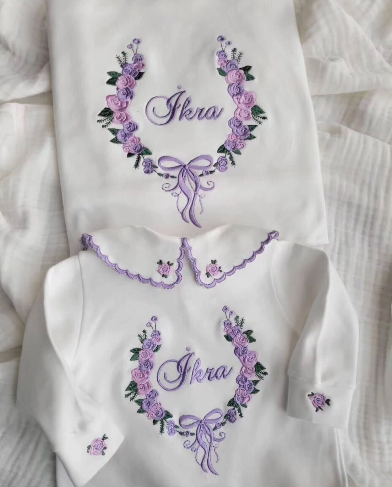 İsimli Lila Gül Nakışlı Kız Bebek Hastane Çıkış Seti - Kişiye Özel %100 Pamuk