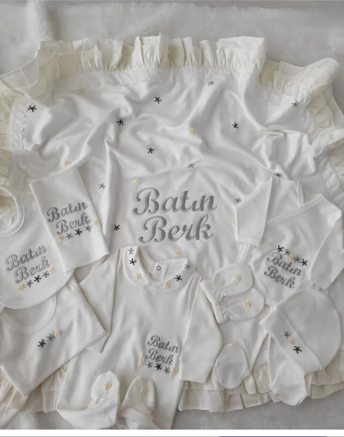 10 parça: Battaniye (90x80 cm), ayaklı tulum, şapka, eldiven, önlük, uzun kol kruvaze body, yarım kol body, iç zıbın, patikli pantolon, ağız mendili