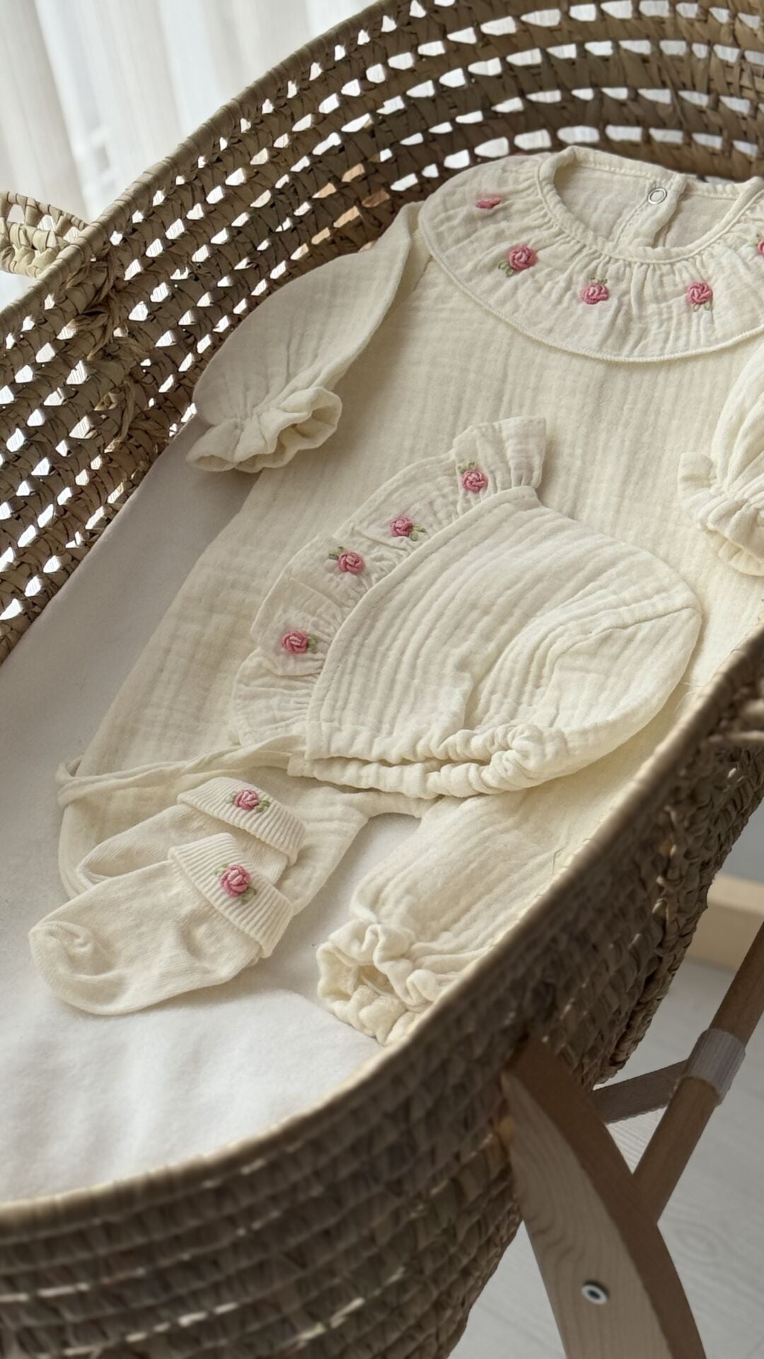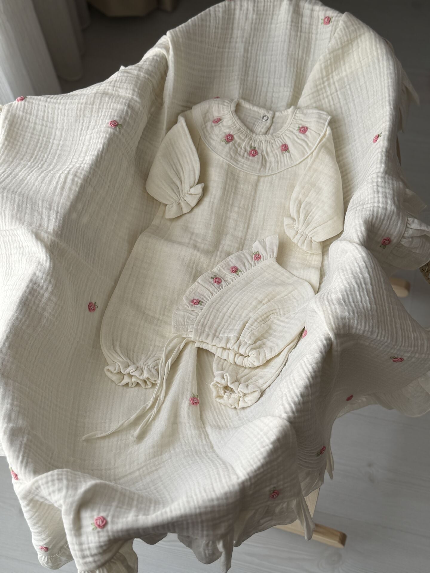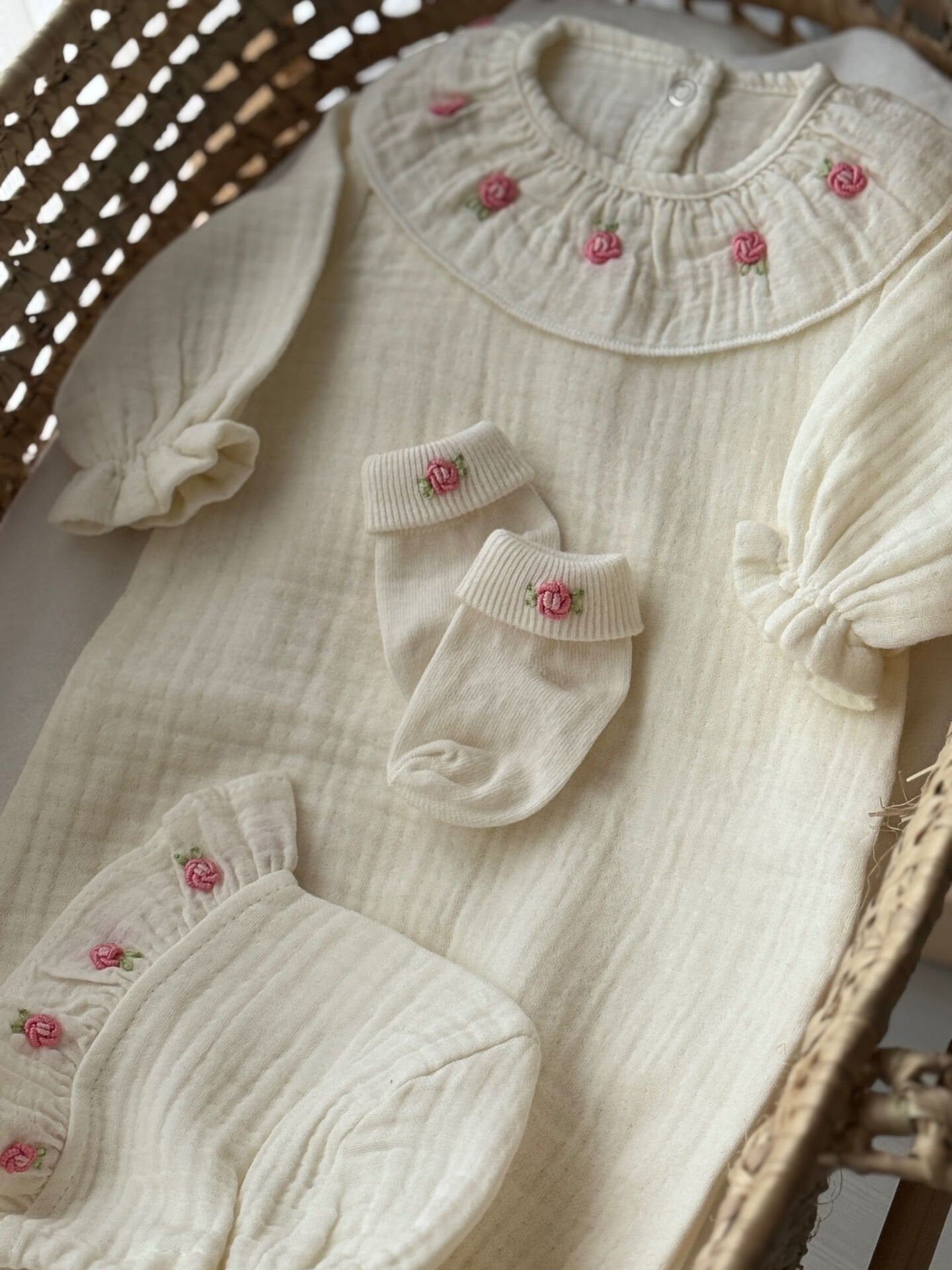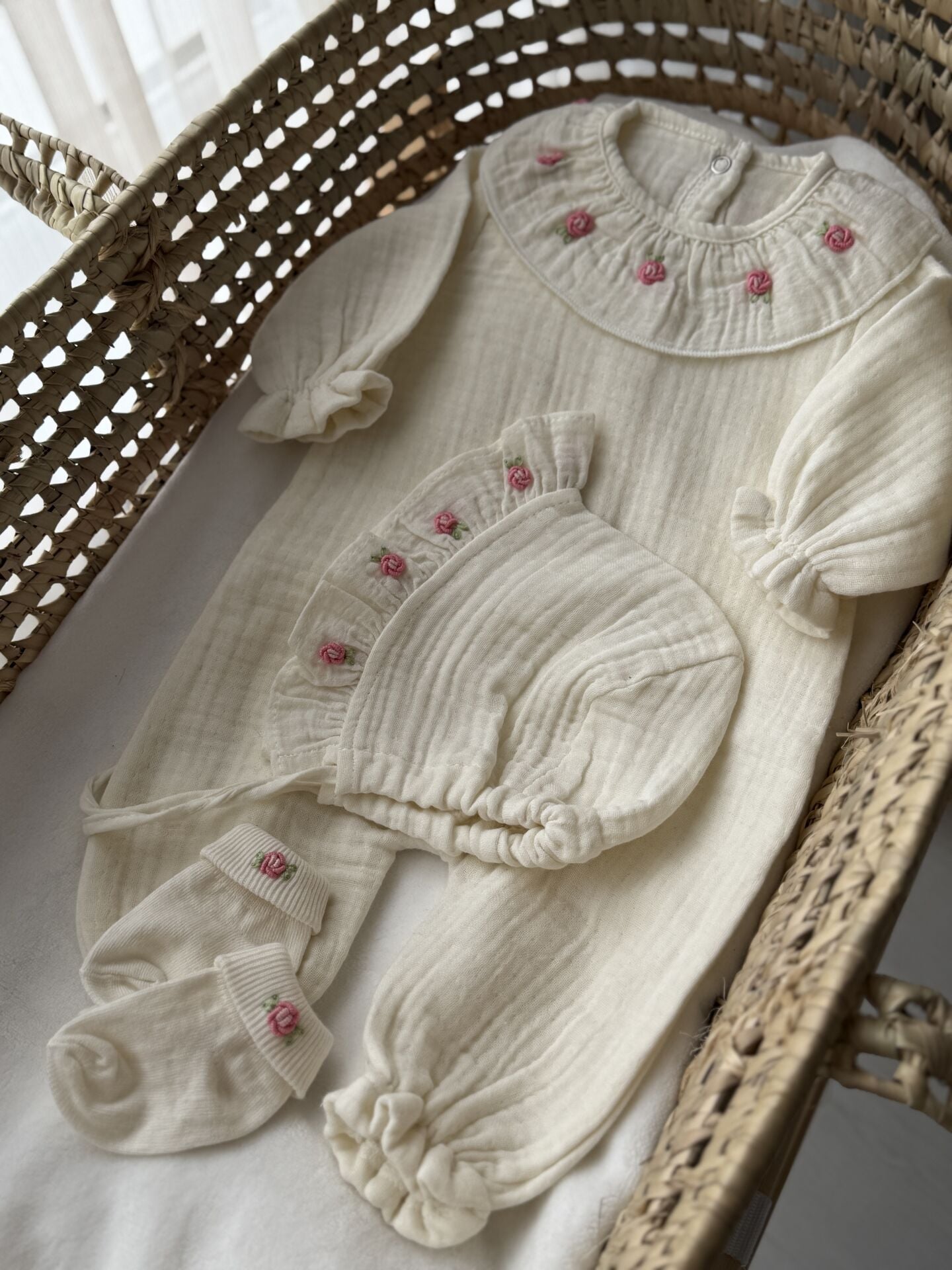 Müslin Nakışlı Bebek Tulum Seti – Yenidoğan Uyumlu | Minik Nakış