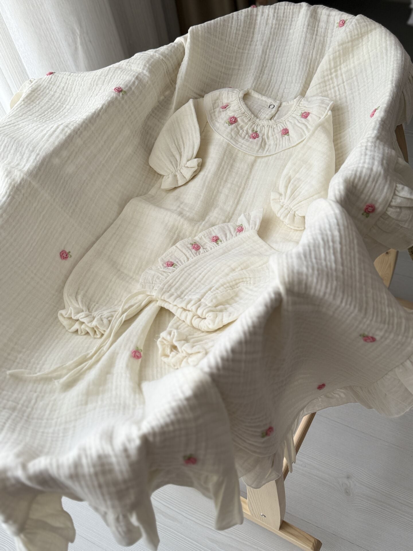 Müslin nakışlı bebek tulum seti, yenidoğan ve hassas ciltli bebekler için özel olarak tasarlanmış doğal ve konforlu bir üründür.