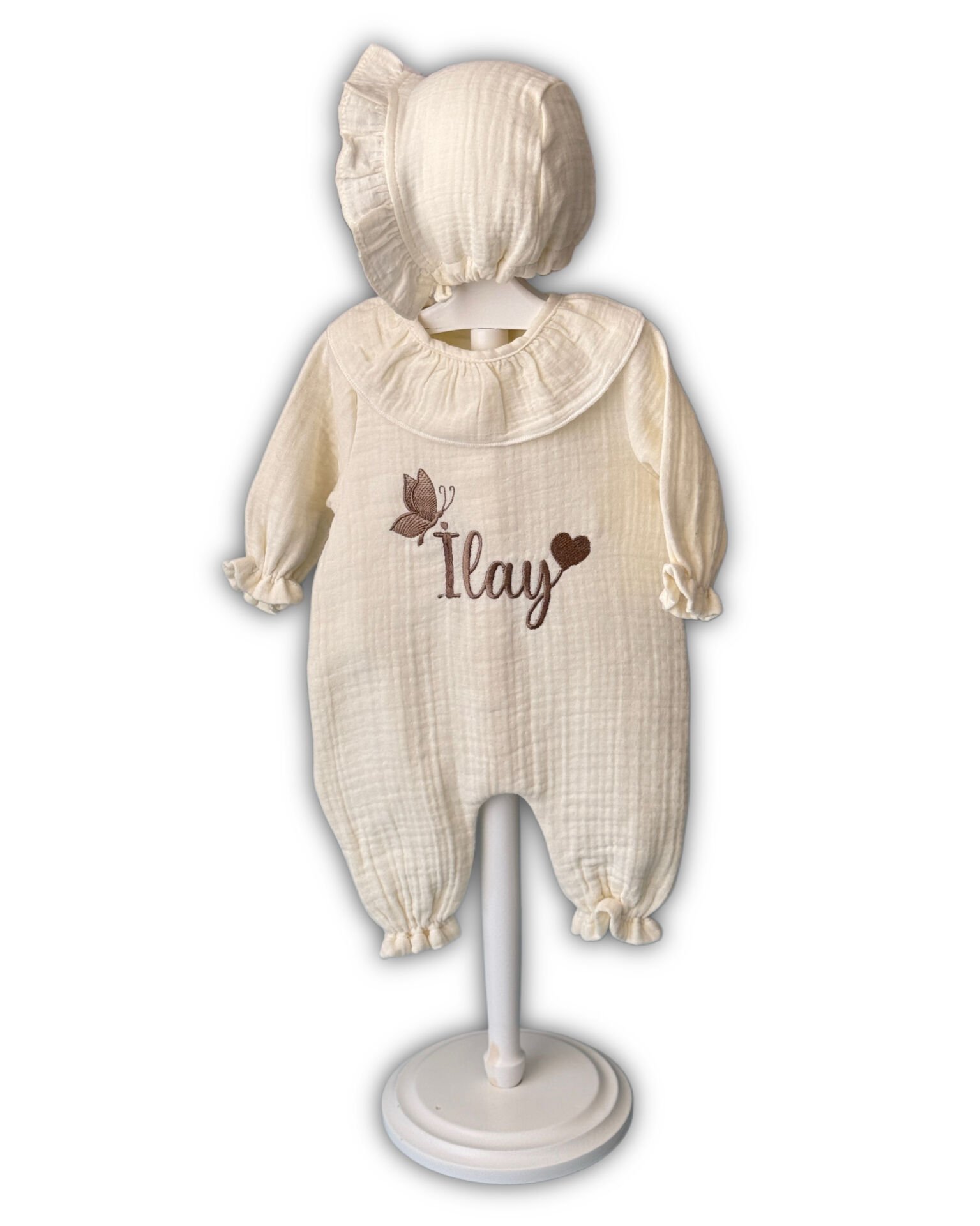 Müslin Nakışlı Bebek Tulum Seti – Yenidoğan Uyumlu Doğal Konfor