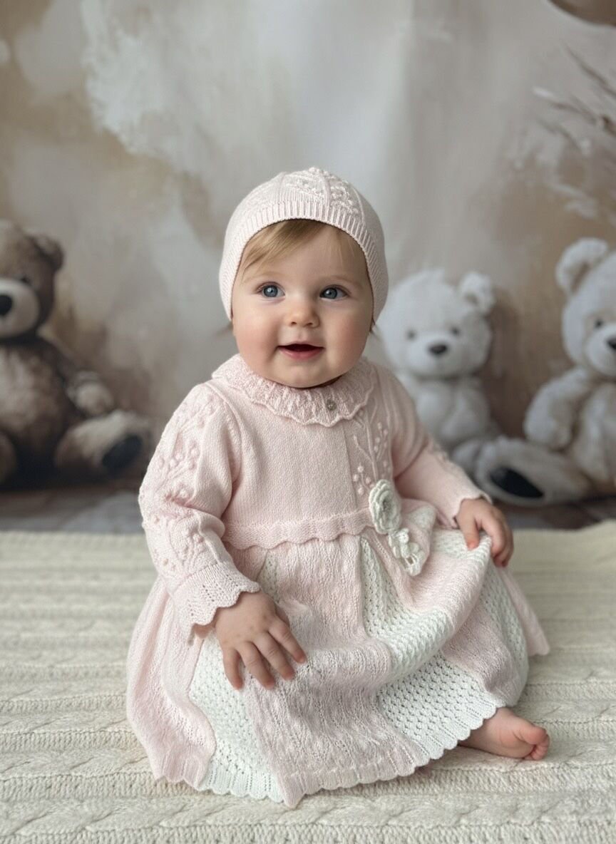 6-24 ay arası beden seçenekleri bulunan örgü pamuklu pembe bebek elbisesi, uzun süre formunu koruyan kaliteli yapısıyla Minik Nakış premium ürün anlayışını yansıtır. Zarif görünümü, konforlu dokusu ve zamansız tasarımıyla kız bebek gardırobunun vazgeçilmez parçalarından biridir.