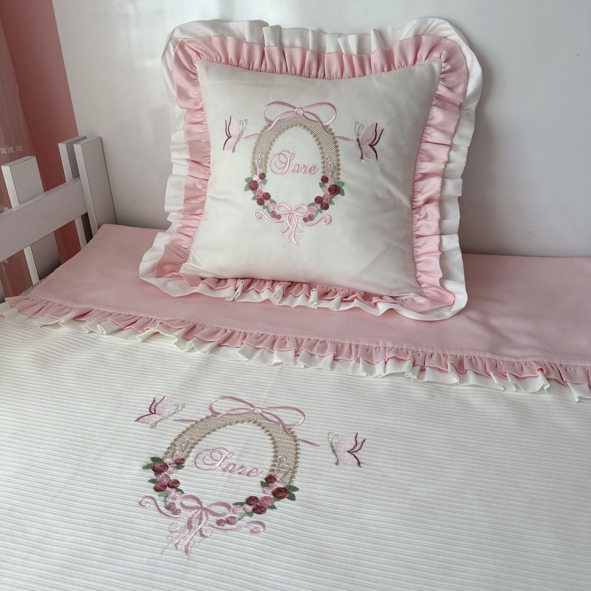 İsimli Kelebek Nakışlı Bebek Pike Takımı - Pembe Bahar Serisi %100 Pamuk