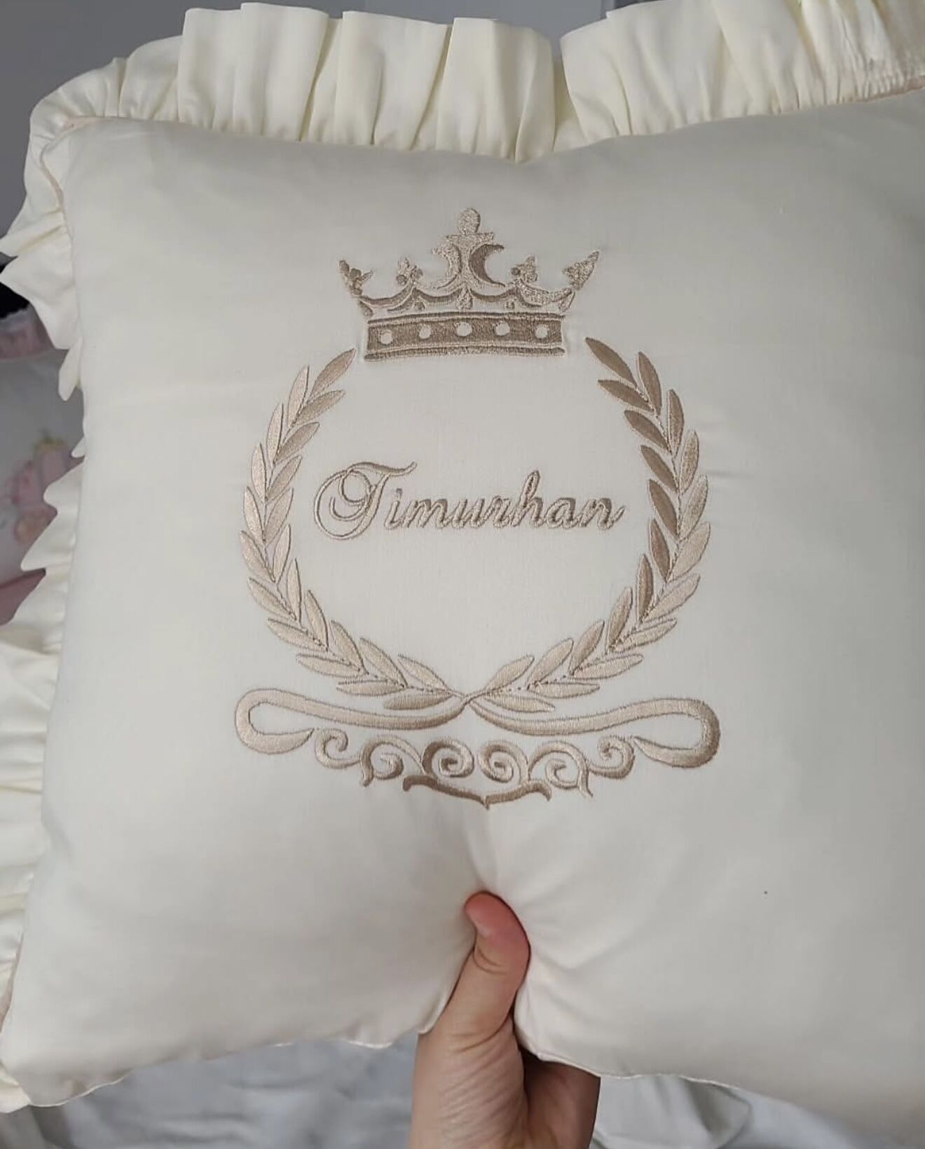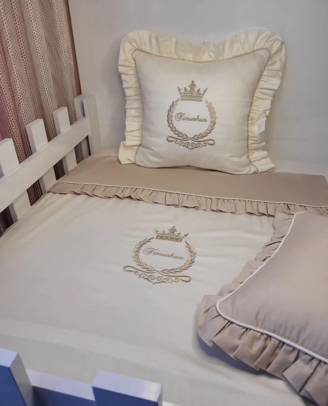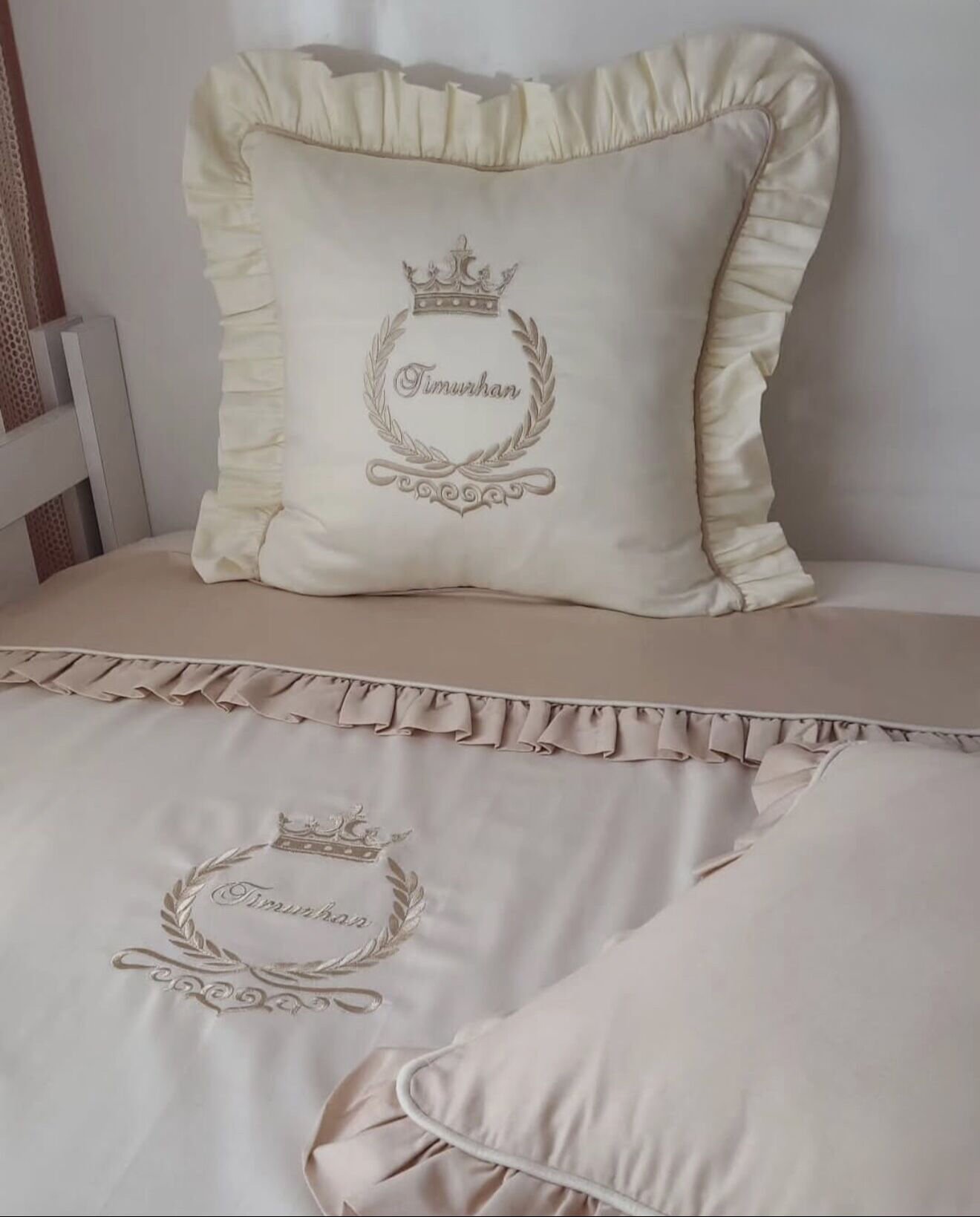 İsimli Kraliyet Tacı ve Çelenk Nakışlı Bebek Nevresim Pike Takımı - Lüks Pamuk Saten