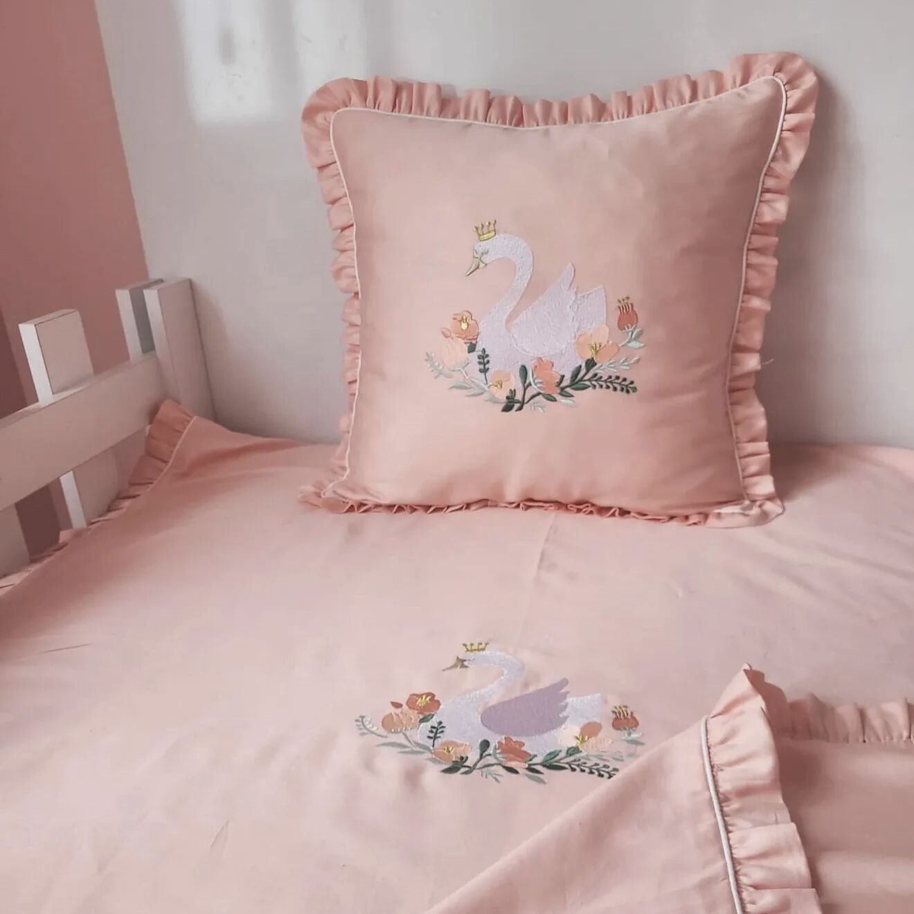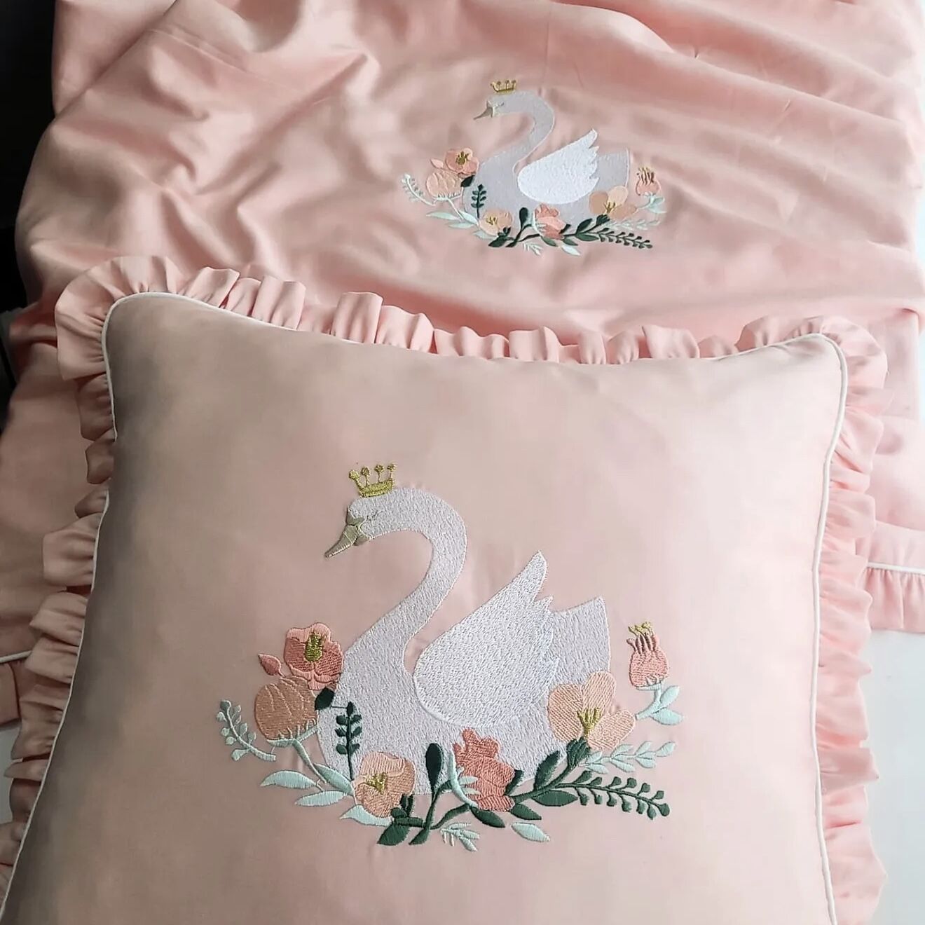 İsimli Taçlı Kuğu Nakışlı Bebek Nevresim Takımı - Lüks Pamuk Seri %100 Pamuk