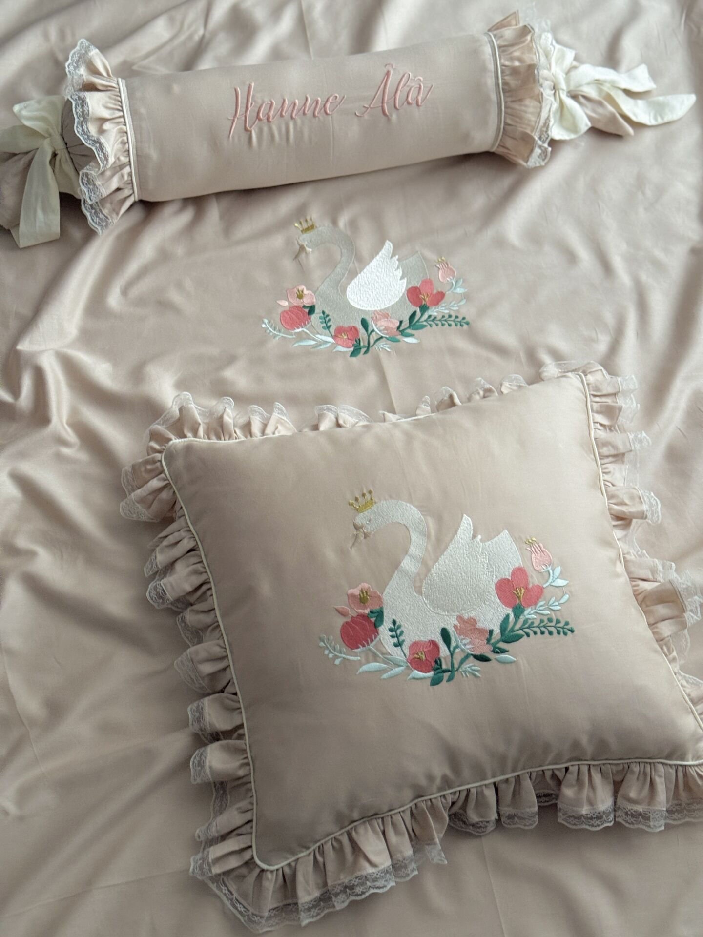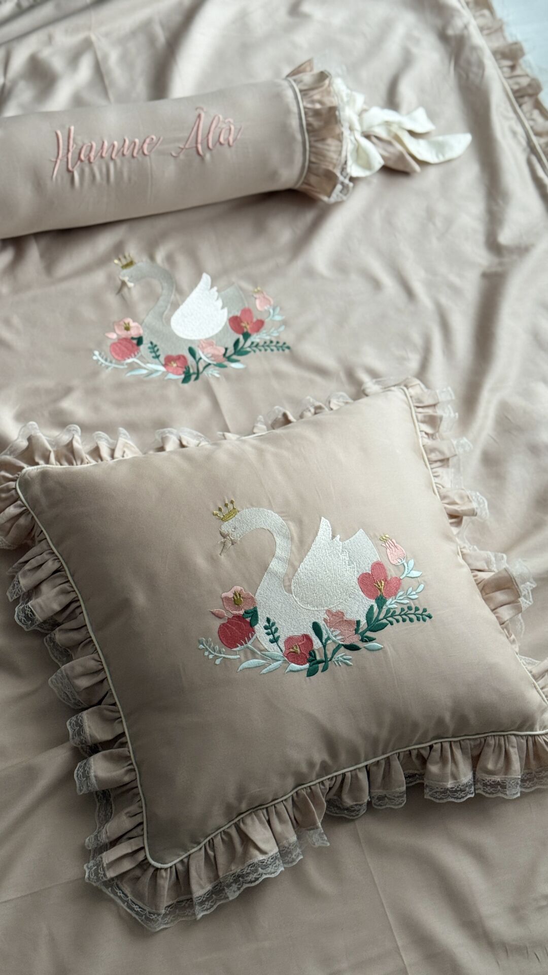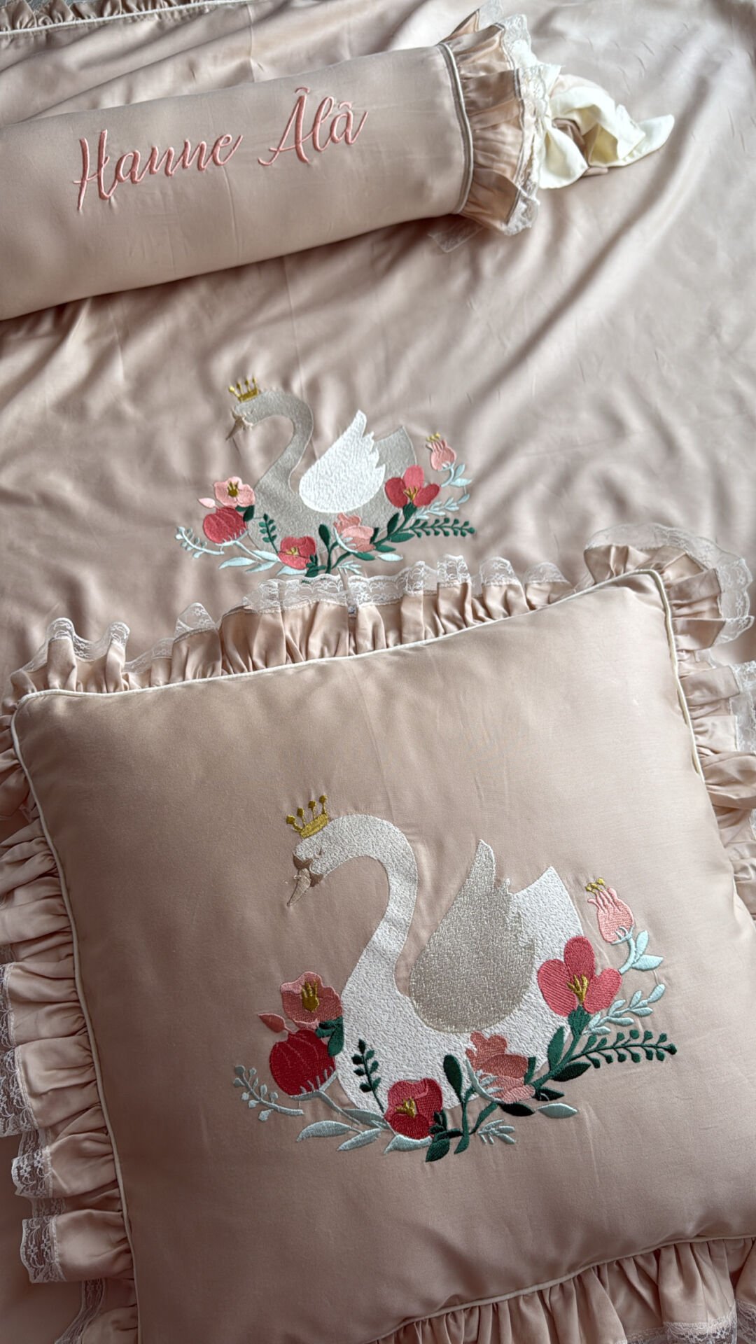 İsimli Soft Renkli Taçlı Kuğu Nakışlı Bebek Nevresim Takımı - %100 Pamuk Modern Seri