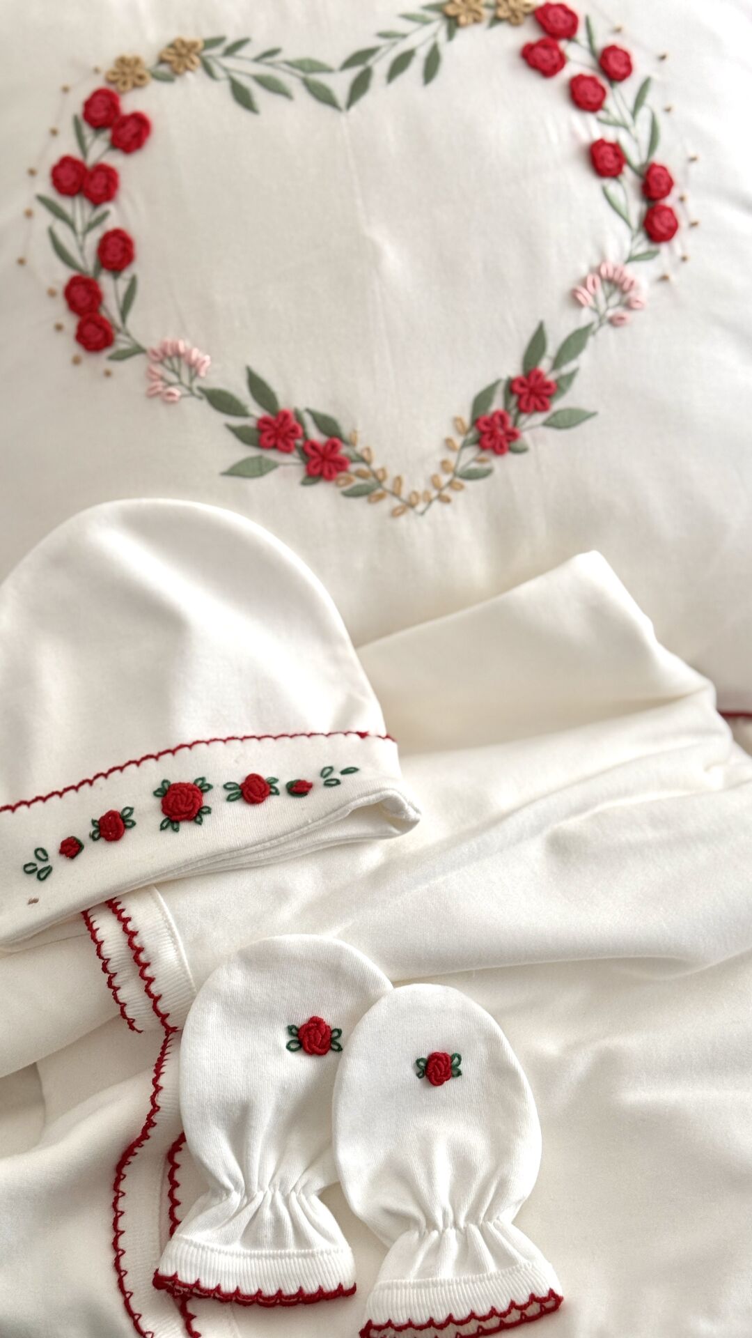 İsimli El Nakışı Rokoko Çiçekli Kalp Bebek Pike Seti - %100 Pamuk