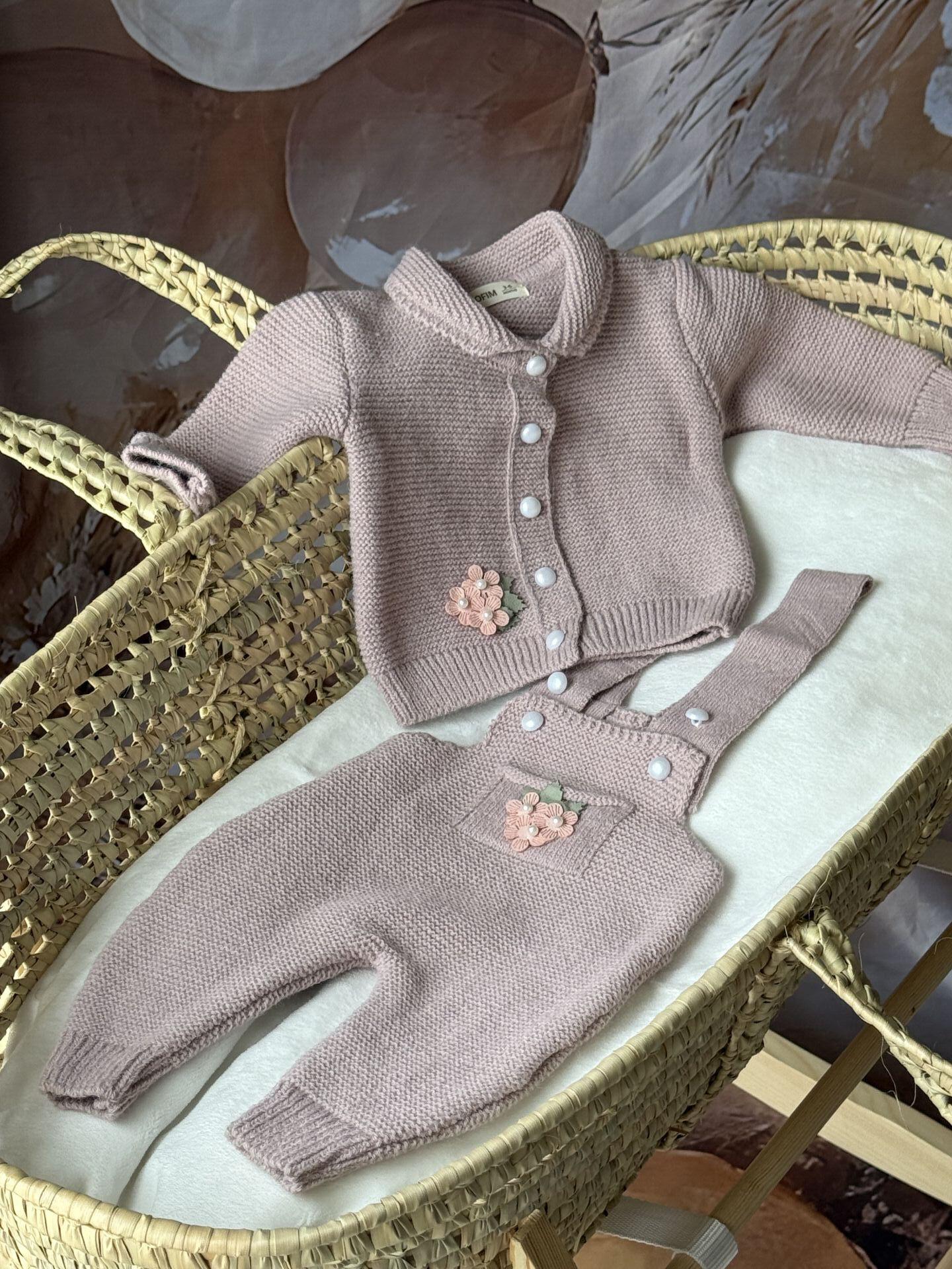 Pudra Örgü Kız Bebek 2’li Takım – Çiçek İşlemeli Hırka ve Salopet | El Örgüsü Görünüm