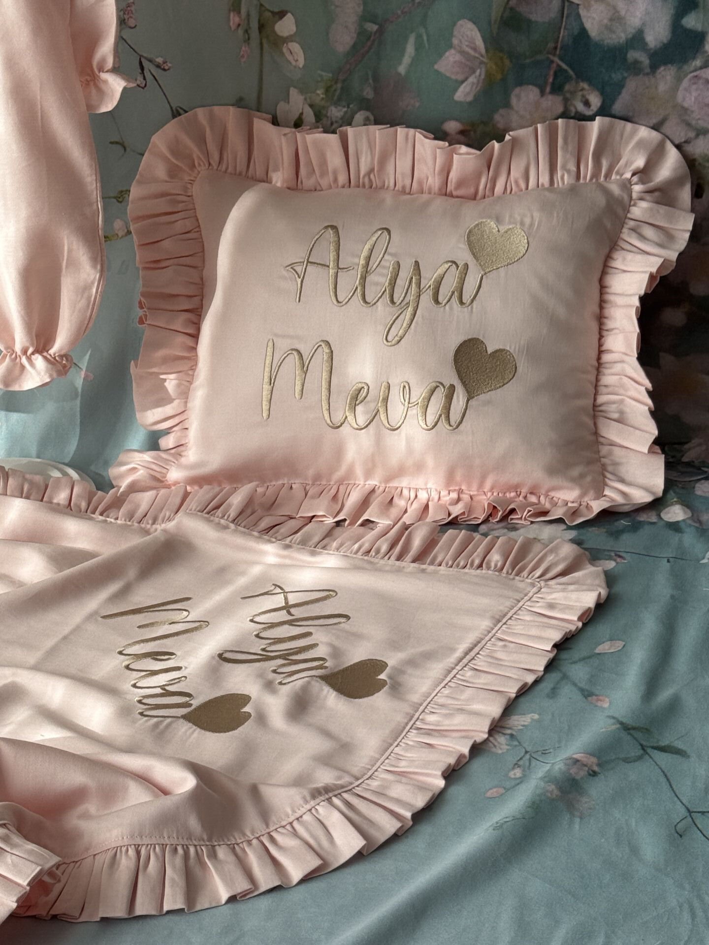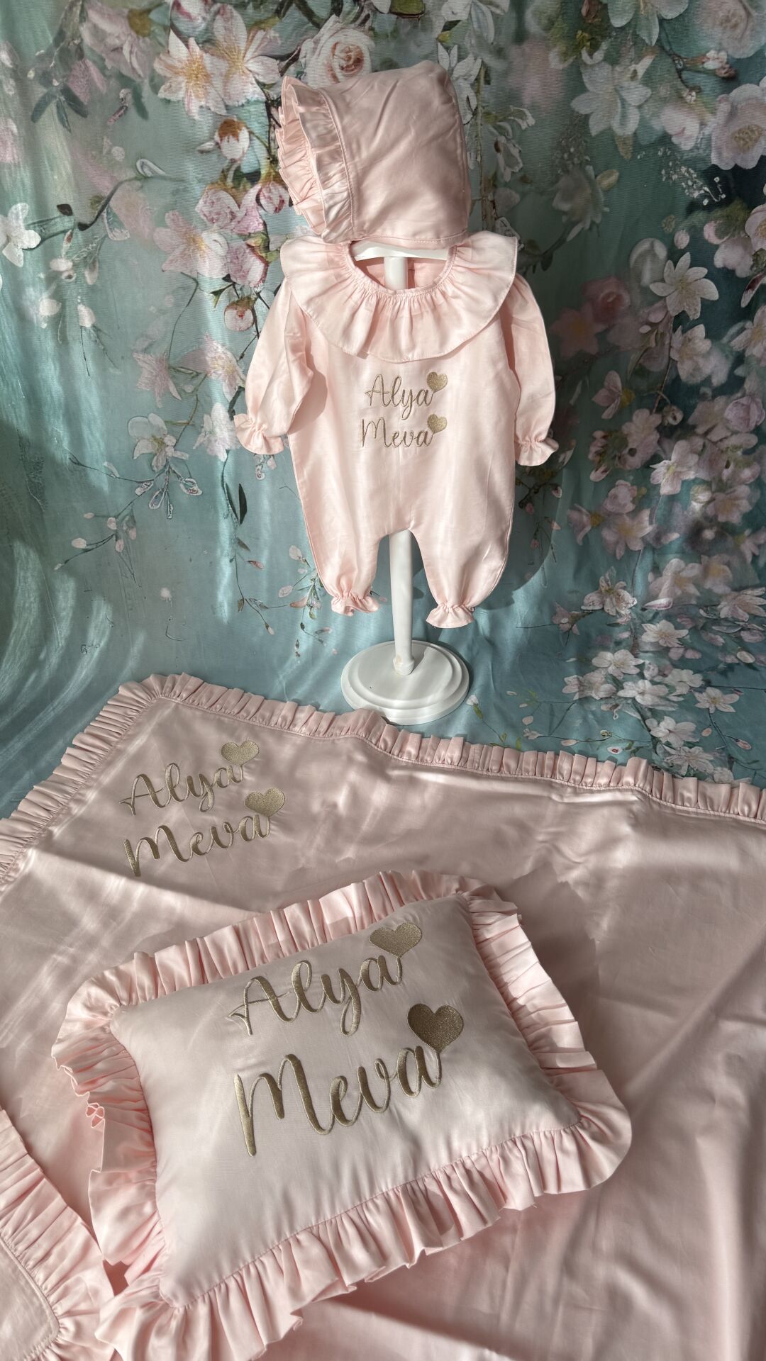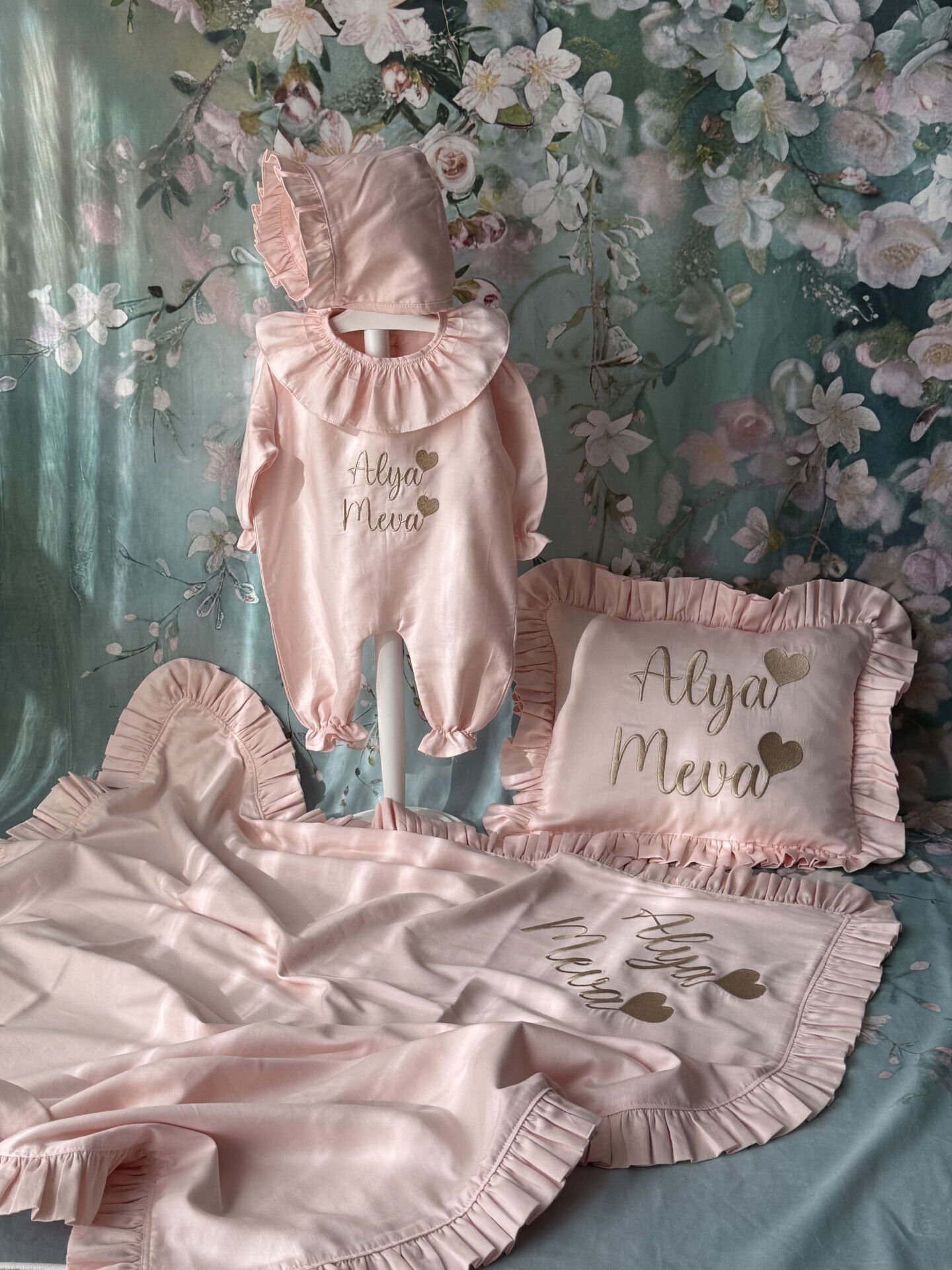 Pamuk saten kumaş yapısı sayesinde ürün antialerjik ve cilt dostudur. Yumuşak dokusu bebeğinizin hassas cildiyle uyum sağlar. Nakışla işlenen isim ve desen detayları sayesinde ürün kişiye özel hazırlanır ve benzersiz bir hatıra sunar. Hastane çıkışı, özel günler ve fotoğraf çekimleri için ideal bir tercihtir. Yeni doğan ziyaretleri ve baby shower organizasyonları için şık ve anlamlı bir hediye alternatifidir.