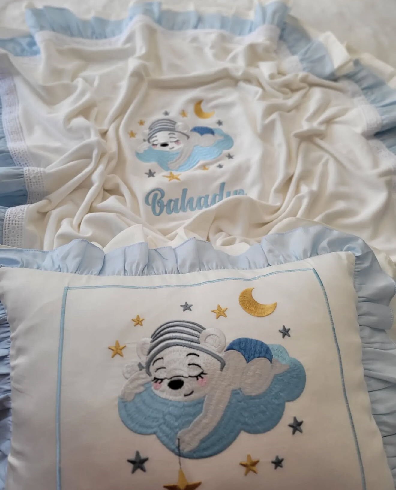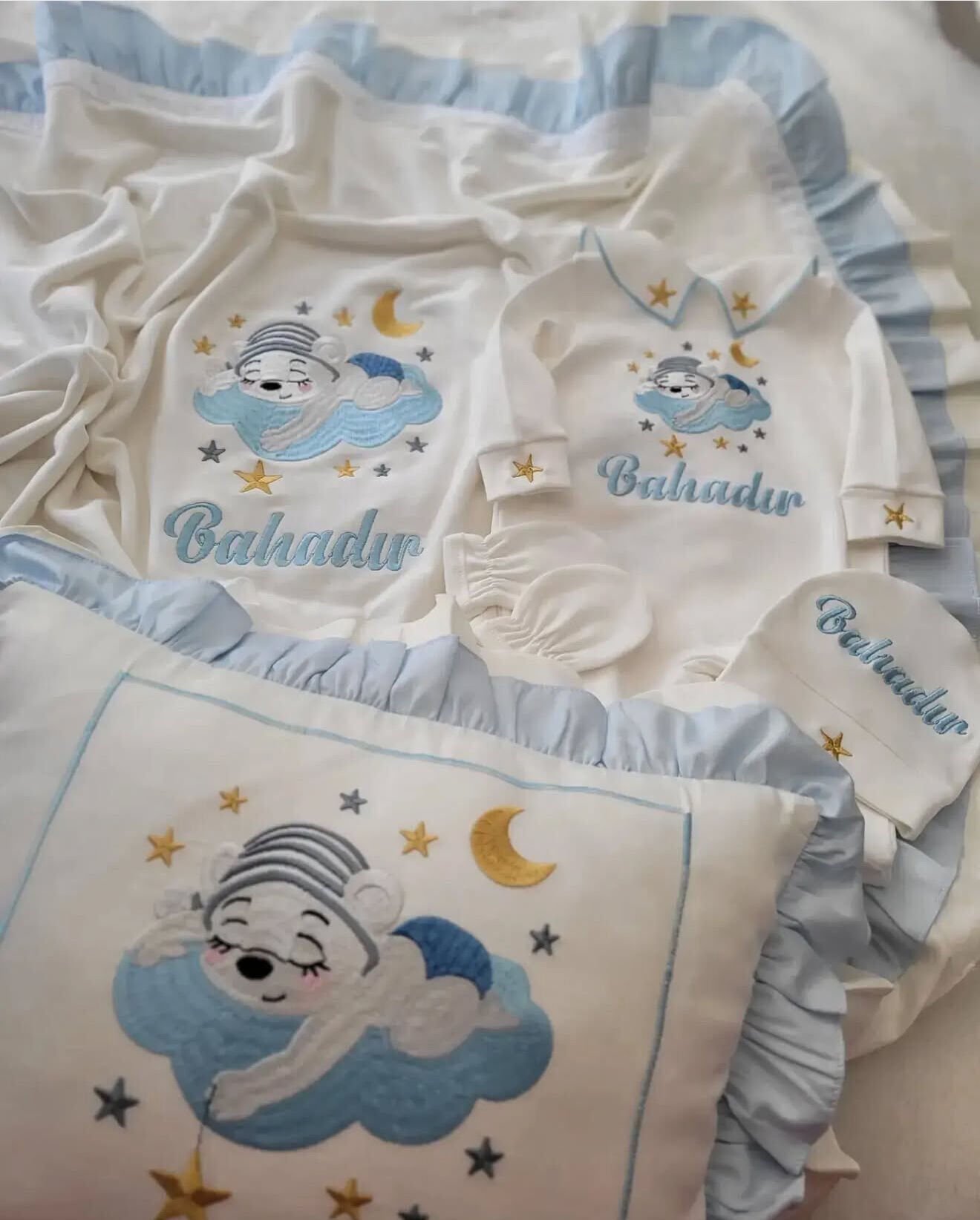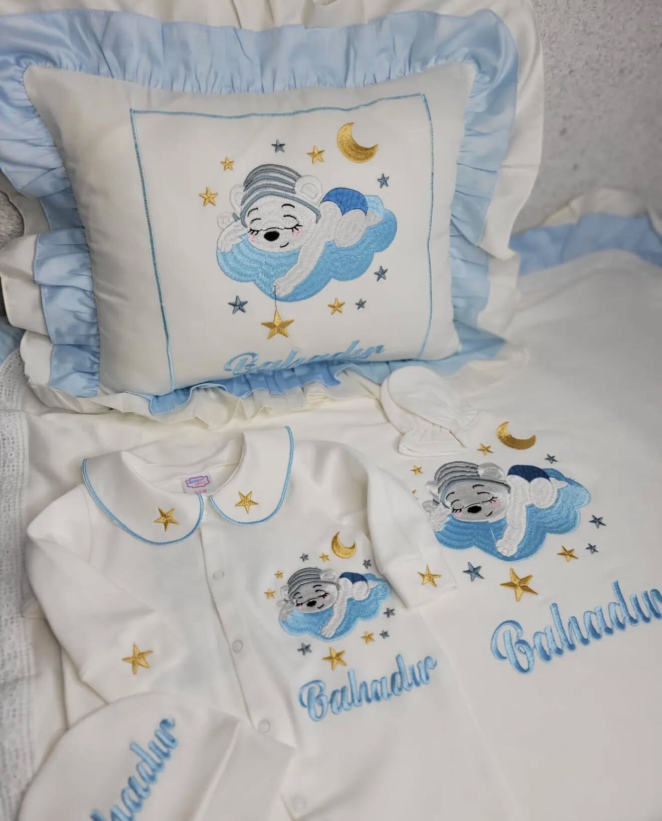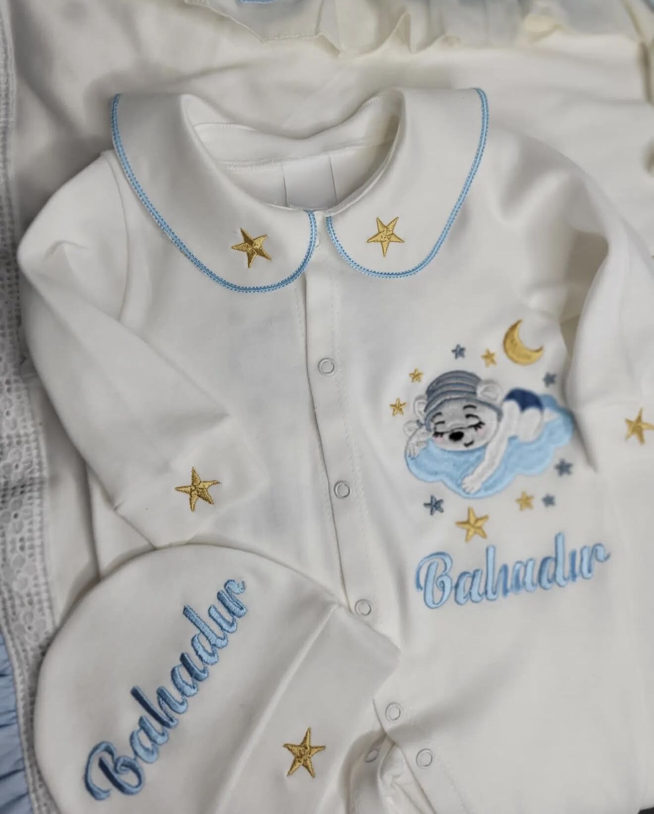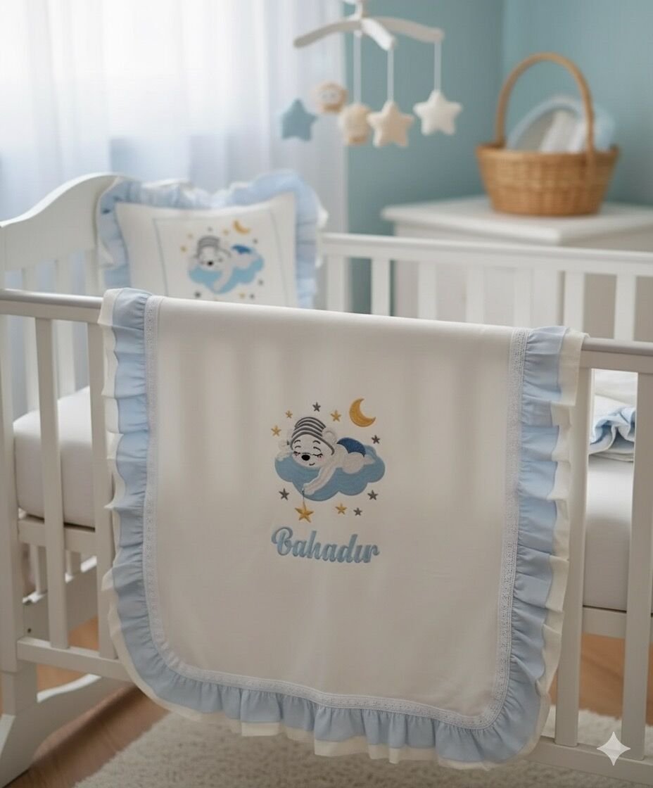 • Tüm işlemeler ve bebeğin ismi, kaliteli makine nakışı ile özenle işlenir. Bu sayede hem şık hem de dayanıklıdır.