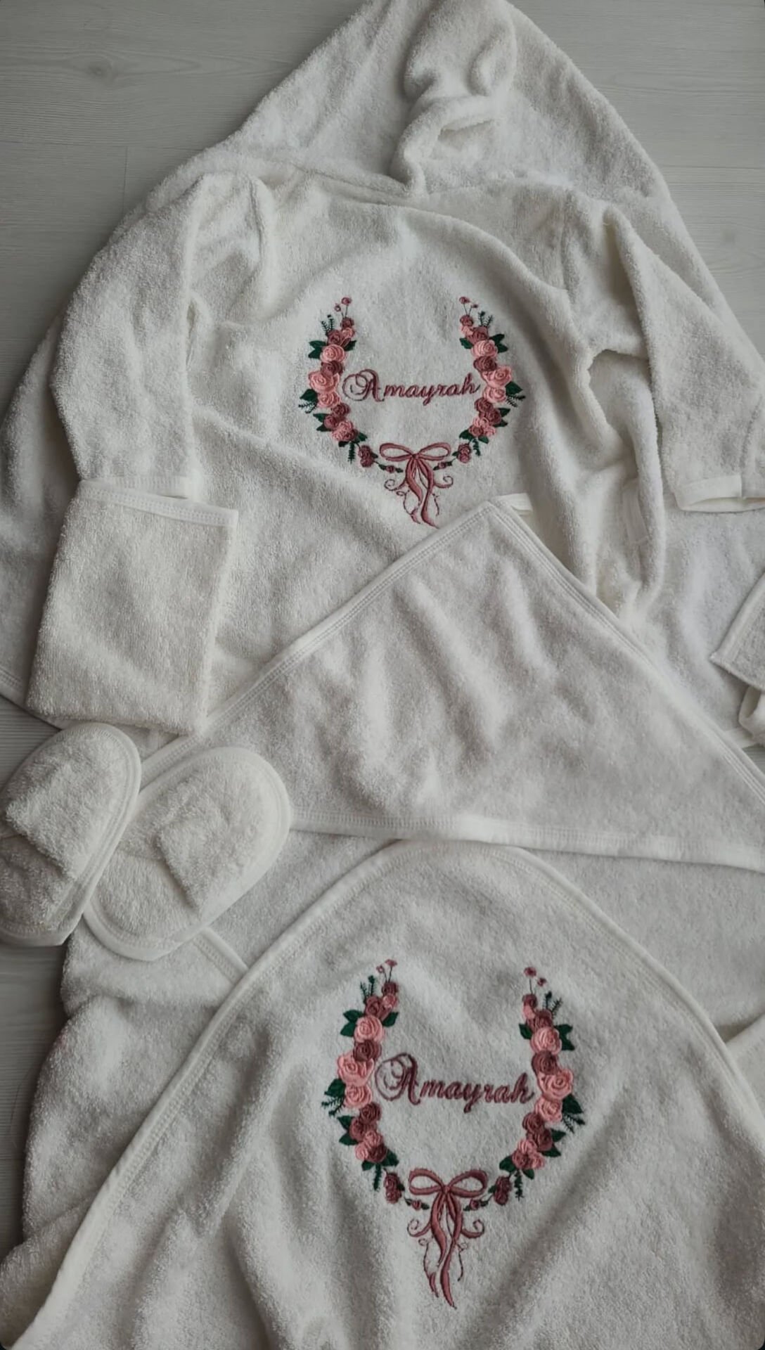 Bornoz: Ön sol kısmında küçük isim nakışı, arka kısmında ise özel nakış işlemeli tasarımıyla zarif bir görünüm sunar.