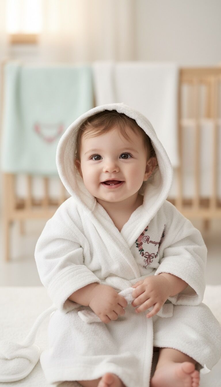 Kişiye özel tasarım: Bebeğinizin ismiyle işlenmiş bornoz ve havlu.